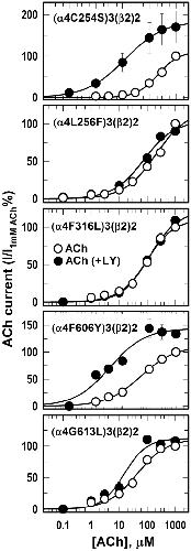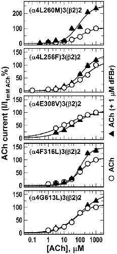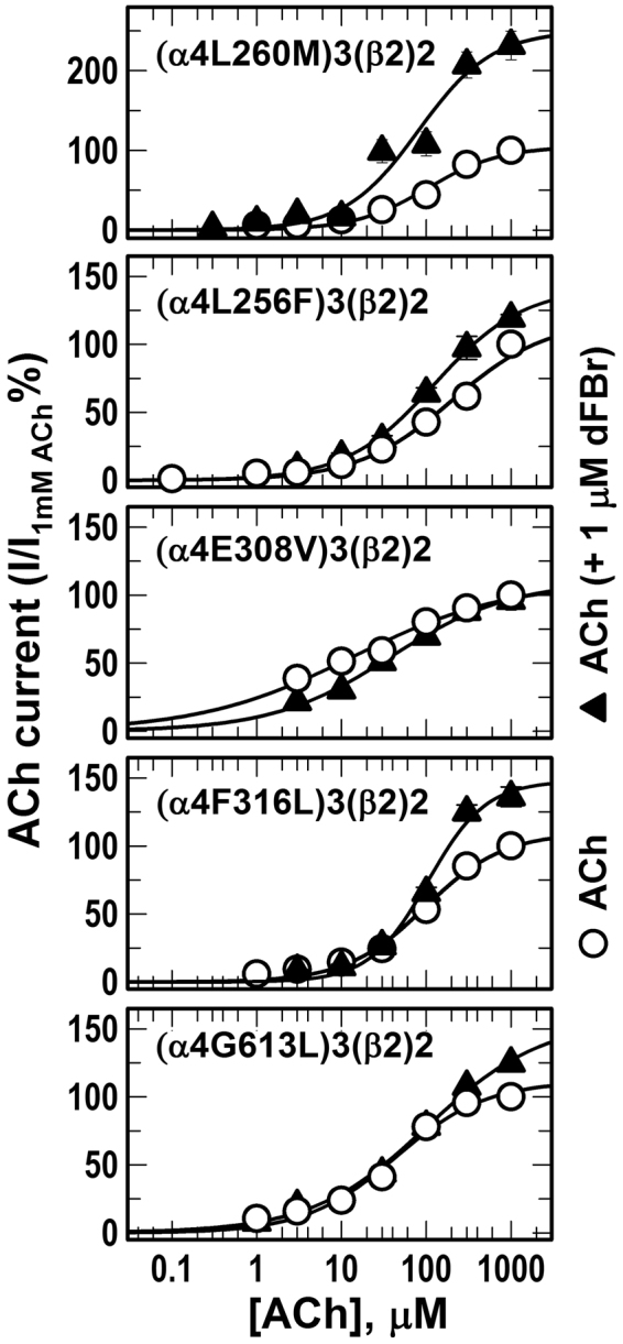 Figure 9. Effect of dFBr on the ACh dose-response curve of mutant α4β2 nAChRs. Currents elicited by Xenopus oocytes expressing mutant (α4)3(β2)2 nAChRs in response to 10-second applications of increasing concentrations of ACh (alone (â) or +1âµM dFBr (â²)) were recorded and normalized to peak currents elicited by 1âmM ACh alone. Replicas from the same oocyte were averaged and the Averageâ±âSE of at least 3 oocytes were plotted and fit to a single site model using Equation 1. ACh Imax in the presence of 1âµM dFBr calculated from curve fitting for (α4C254S)3 (β2)2, (α4L256F)3 (β2)2, (α4L260M)3 (β2)2, (α4E308V)3 (β2)2, (α4F316L)3 (β2)2, (α4F606Y)3 (β2)2, (α4G613L)3(β2)2 were 190â±â08, 142â±â08, 250â±â36, 110â±â06, 148â±â12, 159â±â07, and 157â±â19%, and the probability (P) that Imax in the presence of 1âµM dFBr were different from normalized current response to 1âmM ACh alone (Imaxâ=â100) were <0.001, 0.057, <0.001, 0.602, 0.031, 0.001, 0.012, respectively.