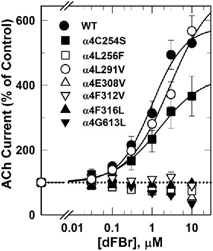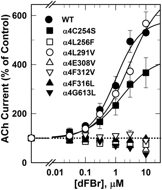 Figure 8. dFBr concentration-dependent potentiation of WT and mutant α4β2 nAChRs. Peak current of Xenopus oocytes expressing WT or mutant (α4)3(β2)2 nAChRs responses to 10 s application of 10 μM ACh in the absence or presence of increasing concentrations of dFBr were normalized to the peak current elicited by 10 µM ACh alone. Shown are data (Average ± SE) from at least 4 different oocytes. Data were fit to a single site model using Equation 1. Values of dFBr potentiation EC50/Imax/h were: for WT (α4)3(β2)2, 1.0 ± 0.3 μM/580 ± 42%/1.1 ± 0.2; for (α4C254S)3(β2)2, 1.5 ± 0.5 μM/430 ± 31%/0.8 ± 0.1; and for (α4L291V)3(β2)2, 2.9 ± 1.9 μM/600 ± 136%/0.8 ± 0.2. For (α4L256F)3(β2)2, (α4E308V)3(β2)2, and (α4G613L)3(β2)2, inhibition at 10 μM dFBr were ~25, 45, and 65%, respectively.