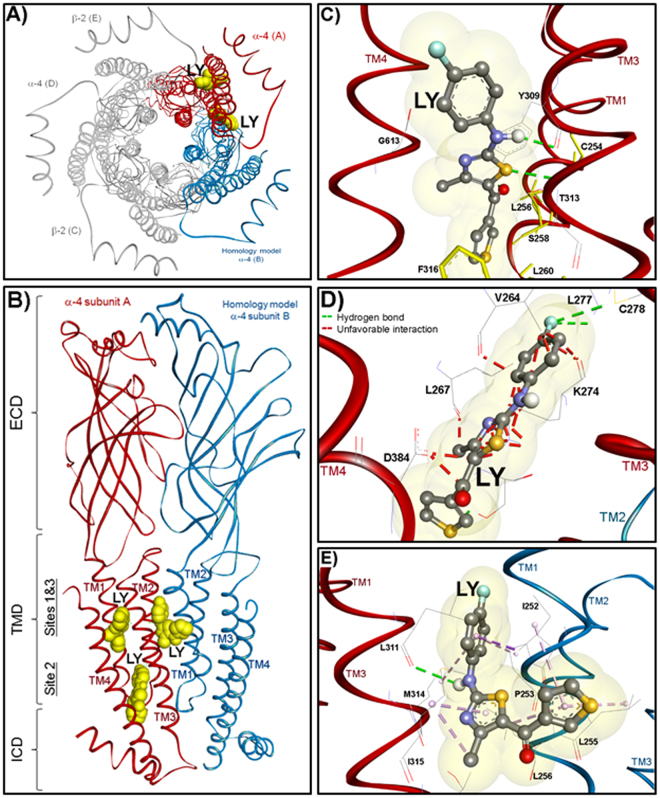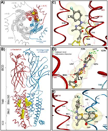 Figure 10. LY2087101 binding sites in the transmembrane domain of (α4)3(β2)2 nAChR. Top (A) and Side (B–E) views showing LY2087101 docked into the (α4)3(β2)2 nAChR at three transmembrane pockets; two within the α4 subunit transmembrane helix bundle (Sites 1 and 2) and one at the α4:α4 transmembrane interface (Site 3) as described under computational docking analyses method section. LY2087101 is shown in yellow space-filling model (A,B) or in ball and stick format colored by elements (C–E; Carbone, gray; oxygen, red;). The nAChRs subunits are shown in ribbon with the α4 subunit that provides the (+)face of the α4:α4 interface colored in red and designated as α4 subunit A. The α4 subunit that provides the (−)face of the α4:α4 interface (colored in cyan and designated as α4 subunit B) does not exist in the crystal structure of (α4)2(β2)3 nAChR (PDB: 5KXI)6 and therefore was derived from this crystal structure by homology modeling as described previously29. The other nAChR subunits are colored in grey (B) or not shown (A) for clarity. Details of LY2087101 interactions with amino acids residues within Binding Site 1–3 are shown in C–E, respectively, with hydrogen bond interactions are shown as green dashed lines, non-bond hydrophobic interactions are shown as violet dashed lines, and unfavorable interactions as red dashed lines.