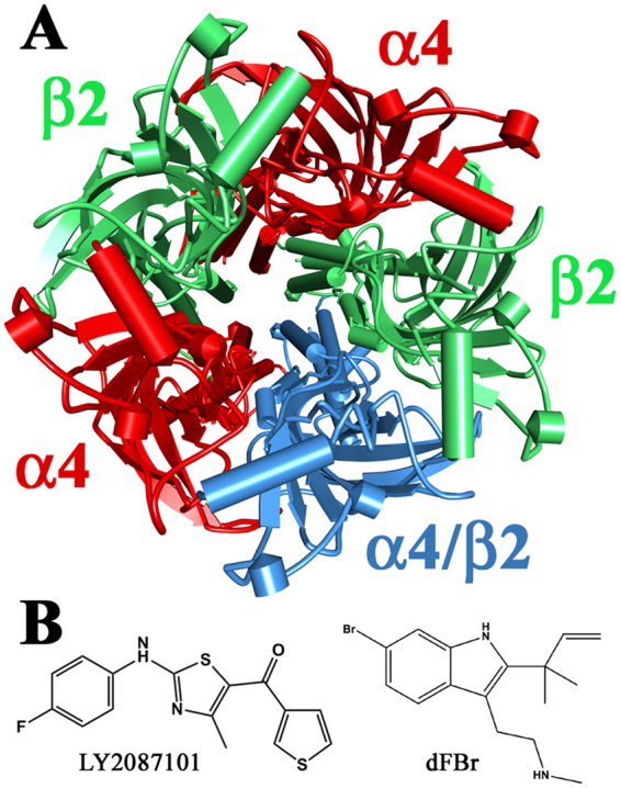 Figure 1. Top views depicting α4β2 nAChR based on the X-ray structure of human (α4)2(β2)3 nAChR (PDB: 5KXI) and the chemical structures of LY2087101 and dFBr.