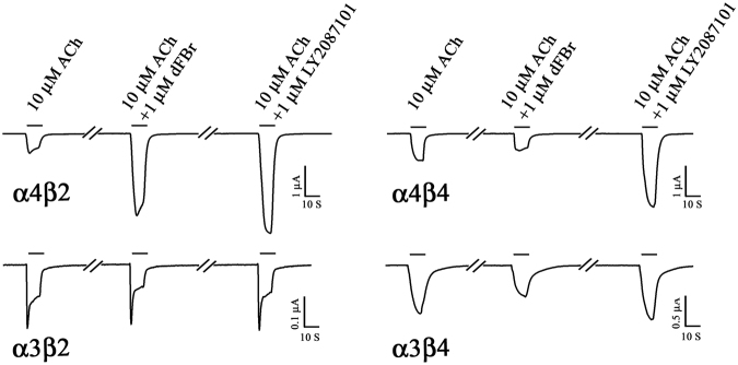 Figure 4. LY2087101 potentiation of α4β2 nAChR requires α4 but not β2 subunits. Representative two-electrode voltage clamp traces showing the effect of LY2087101 or dFBr at 1 μM on ACh-induced current responses of Xenopus oocytes expressing α4β2, α4β4, α3β2, or α3β4 nAChR.