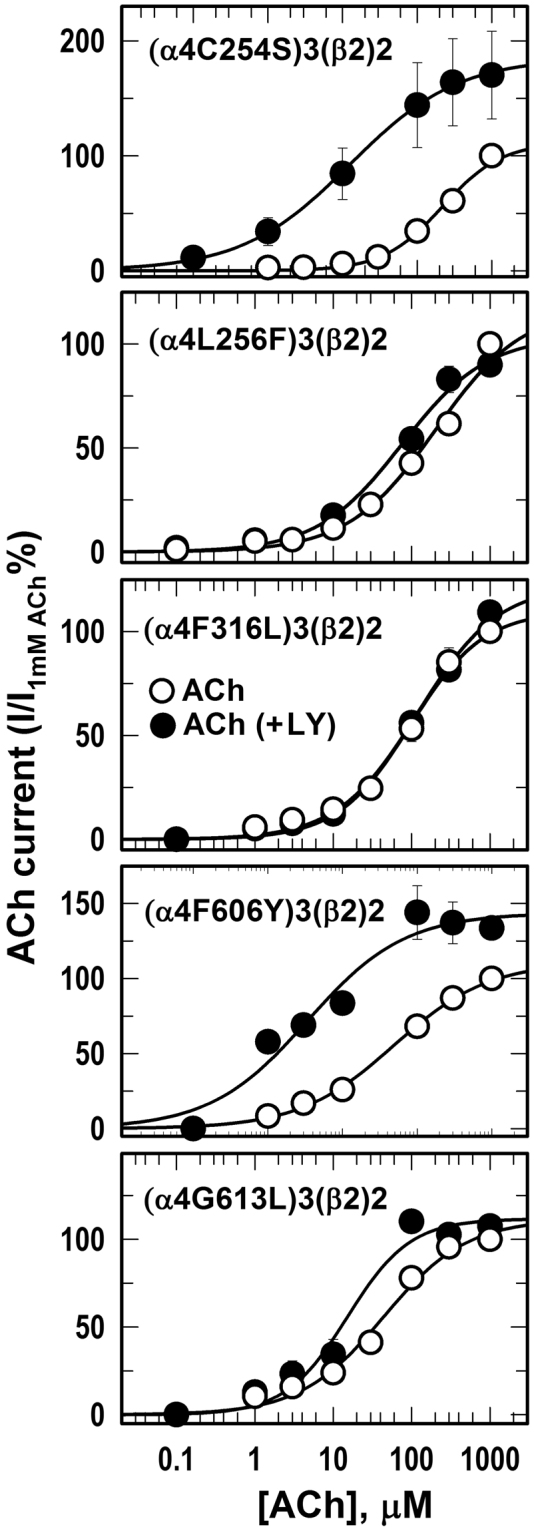 Figure 7. Effect of LY2087101 on the ACh dose-response curve of mutant α4β2 nAChRs. Currents elicited by Xenopus oocytes expressing (α4)3(β2)2 nAChRs containing point mutation within the α4 subunit in response to 10-second applications of increasing concentrations of ACh (alone (â) or +1âµM LY2087101 (â)) were recorded and normalized to peak currents elicited by 1âmM ACh alone. Replicas from the same oocyte were averaged and the Averageâ±âSE of data from at least 3 oocytes were plotted and fit to a single site model using Equation 1. For (α4C254S)3(β2)2; (α4L256F)3(β2)2; (α4S258M)3(β2)2; (α4L260M)3(β2)2; (α4T261D)3(β2)2; (α4F316L)3(β2)2; (α4F606Y)3(β2)2; (α4G613L)3(β2)2 nAChRs, ACh Imax (Aveâ±âSEM) calculated from the fit of ACh concentration-response curves in the presence of 1âµM LY2087101 were 185â±â04; 104â±â09; 232â±â10; 264â±â80; 180â±â23; 122â±â13; 144â±â013; 112â±â9%, and the probability (P) that Imax in the presence of 1âµM LY2087101 were different from normalized current response to 1âmM ACh alone (Imaxâ=â100) were <0.001, 0.878, <0.001, <0.001, 0.003, 0.475, 0.062, and 0.442, respectively.