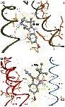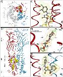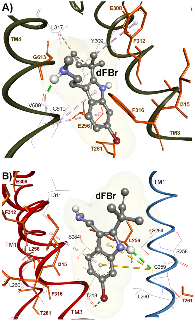 Figure 11. dFBr binding sites in the transmembrane domain of (α4)3(β2)2 nAChR. Side views showing dFBr docked within the α4 subunit transmembrane helix bundle (Binding Site 1, A) and at the α4:α4 transmembrane interface (Binding Site 3, B). The α4 subunits are shown as ribbon with the subunit that provides the (+)face and (−)face of the α4:α4 interface are colored in red and cyan, respectively. dFBr is shown in ball and stick format colored by element whereas key amino acids side chains are shown in line format. Hydrogen bond interactions and non-bond hydrophobic interactions between dFBr and amino acids residues within Binding Site 1 and 3 are shown as green and violet dashed lines, respectively.