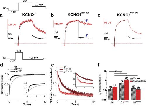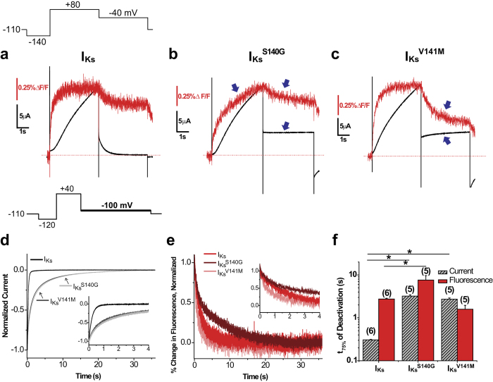 Figure 1. In the absence of KCNE1, S140G slows both current and voltage sensor deactivation, whereas V141M slows neither.(aâc) Current (black) and fluorescence (red) traces for KCNQ1 (a), KCNQ1S140G (b), and KCNQ1V141M (c) using a single pulse protocol. From a prepulse of â140âmV, a test pulse was applied at +60âmV, followed by a repolarizing step to â40âmV. Cells were held at â80âmV. (d) Normalized current during deactivation at â100âmV for KCNQ1, KCNQ1S140G and KCNQ1V141M. Inset shows first 2âs of deactivation. Deactivation was examined using the following voltage protocol: from a prepulse of â140âmV, an activating pulse was applied at +40âmV, followed by a repolarizing step to â100âmV. Channels were held at â80âmV. (e) Normalized percent change in fluorescence during deactivation at â100âmV. Inset shows first 2âs of deactivation. (f) Time to half deactivation (t1/2). Data are shown as meanâ±âSEM (error bars). *Pâ<â0.05.