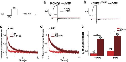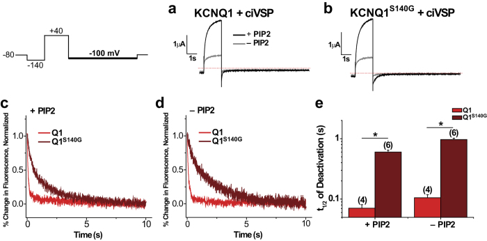 Figure 2. In the absence of KCNE1, S140G slowing of voltage sensor deactivation is independent of channel opening based on PIP2 depletion.The following protocol was used: from a prepulse of â140âmV, an activating pulse was applied at +40âmV, followed by a repolarizing step to â100âmV. Channels were held at â80âmV. This protocol was used before and after PIP2 depletion by ciVSP, which was activated by repeated depolarization. (a,b) Current before (+PIP2) and after PIP2 depletion (âPIP2) for KCNQ1 (a) and KCNQ1S140G (b). (c,d) Normalized fluorescence deactivation traces at â100âmV for KCNQ1 (red) and KCNQ1S140G (dark red) before (c) and after (d) PIP2 depletion. (e) Time to half deactivation (t1/2) of fluorescence. Data are shown as meanâ±âSEM (error bars). *Pâ<â0.05.