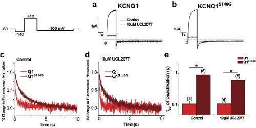 Figure 3. UCL2077 inhibition confirms that KCNQ1S140G slow voltage sensor deactivation independent of channel opening.The following protocol was used: from a prepulse of â140âmV, an activating pulse was applied at +40âmV, followed by a repolarizing step to â100âmV. Channels were held at â80âmV. This protocol was used before and after inhibition of current with 10âμM UCL2077. (a,b) Current before and after inhibition with UCL2077 for KCNQ1 (a) and KCNQ1S140G (b). (c,d) Normalized fluorescence deactivation traces at â100âmV for KCNQ1 (red) and KCNQ1S140G (dark red) in drug-free control (c) and in 10âμM UCL2077 (d). (e) Time to half deactivation (t1/2) of fluorescence. Data are shown as meanâ±âSEM (error bars). *Pâ<â0.05.
