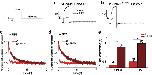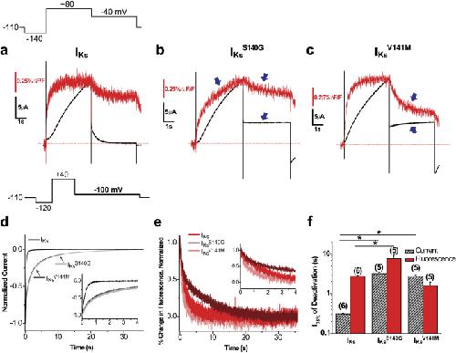 Figure 4. In the presence of KCNE1, S140G slows current deactivation and voltage sensor movement while V141M slows current deactivation without slowing voltage sensor movement.(aâc) Current and fluorescence traces for IKs (a), IKsS140G (b), and IKsV141M (c) in the presence of KCNE1 using a single pulse protocol. From a prepulse of â140âmV, a test pulse was applied at +80âmV followed by a repolarizing step to â40âmV. Cells were held at â110âmV. Arrows indicate effect of mutations on current or fluorescence. (d) Normalized current during deactivation at â100âmV for IKs, IKsS140G, and IKsV141M. Inset shows the first 4âs of deactivation. Deactivation was examined using the following voltage protocol: from a prepulse of â120âmV, an activating pulse was applied at +40âmV, followed by a repolarizing step to â100âmV. Channels were held at â110âmV. (e) Normalized percent change in fluorescence during deactivation at â100âmV. Inset shows first 4âs of deactivation. (f) Time to 75% deactivation (t75%). Data are shown as meanâ±âSEM (error bars). *Pâ<â0.05.