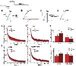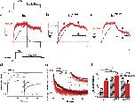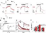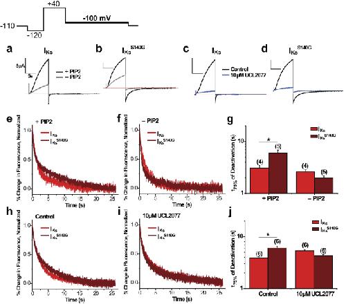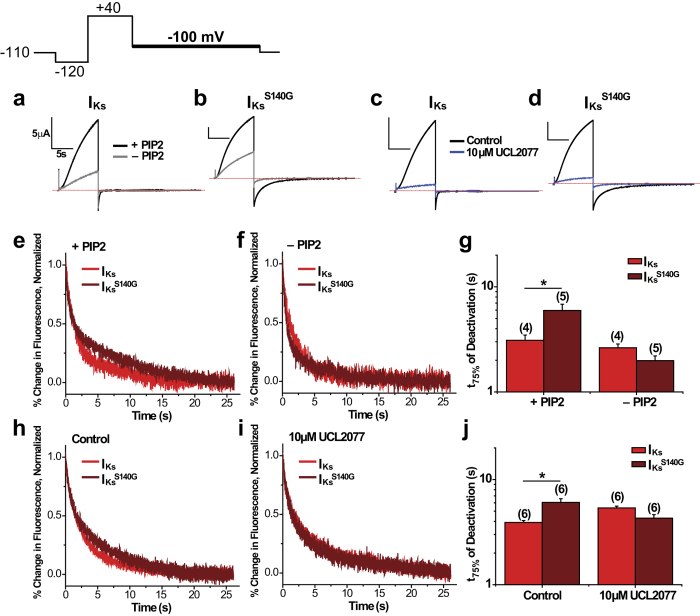 Figure 5. In the presence of KCNE1, S140G slowing of voltage sensor deactivation is dependent on channel opening.The following protocol was used: from a prepulse of â140âmV, an activating pulse was applied at +40âmV, followed by a repolarizing step to â100âmV. Channels were held at â110âmV. (a,b) Current measured before (+PIP2) and after PIP2 depletion (âPIP2) for IKs (a) and IKsS140G (b). (c,d) Current measured in drug-free control and in 10âμM UCL2077 for IKs (c) and IKsS140G (d). (e,f) Normalized fluorescence deactivation traces at â100âmV before (e) and after PIP2 depletion (f) for IKs (red) and IKsS140G (dark red). (g) Time to 75% deactivation (t75%) of fluorescence before and after PIP2 depletion. (h,i) Normalized fluorescence deactivation traces at â100âmV in drug-free control (h) and in 10âμM UCL2077 (i) for IKs (red) and IKsS140G (dark red). (j) Time to 75% deactivation (t75%) of fluorescence in control and in 10âμM UCL2077. Data are shown as meanâ±âSEM (error bars). *Pâ<â0.05.