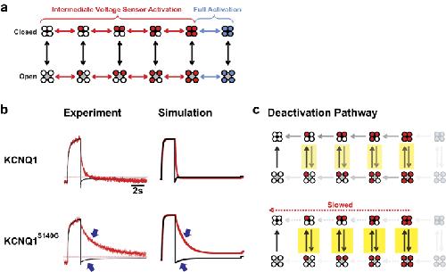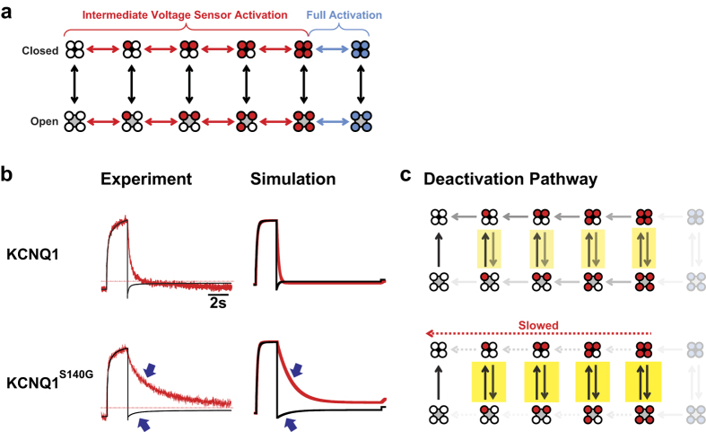 Figure 6. Simulating effects of S140G on KCNQ1 gating in the absence of KCNE1.(a) Model of KCNQ1 gating. In this model, KCNQ1 can exist in distinct channel states. Horizontal transitions represent voltage sensor movement, while vertical transitions represent pore opening/closing. Voltage sensors can exist in the resting (white), intermediate (red), or fully activated state (blue). (b) Comparing experimental with simulated current (black) and fluorescence (red) traces for KCNQ1 and KCNQ1S140G. (c) Descriptions of deactivation pathways at â100âmV for KCNQ1 and KCNQ1S140G based on model rates. Arrows with greater opacity represent higher probability of channels entering the transitions specified. In the absence of KCNE1, the probability of channels existing in fully activated voltage sensor states (transparent) is low. The KCNQ1 channels can open and close in intermediate voltage sensor states during deactivation. KCNQ1S140G slows voltage sensor deactivation, which causes increased channel openings and closings, as indicated by highlighting. KCNQ1S140G thus indirectly slows current deactivation.