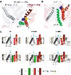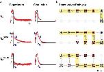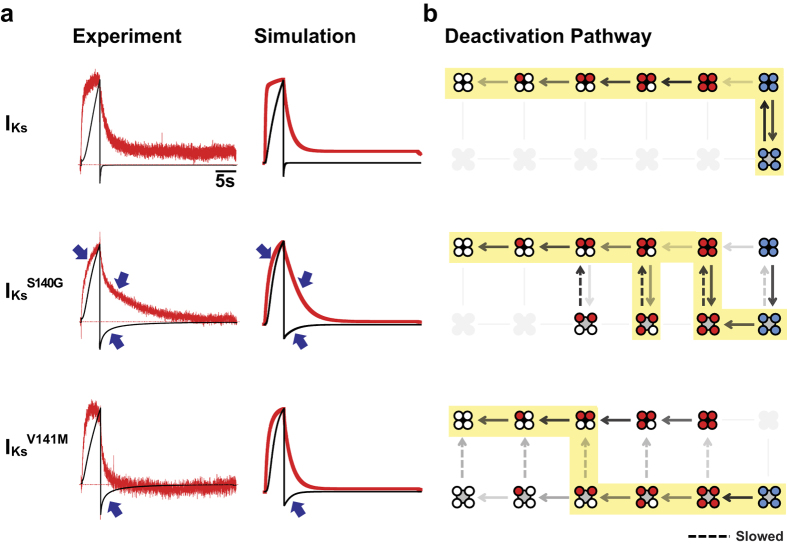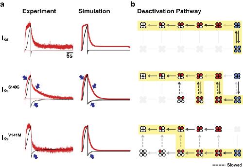 Figure 7. Simulating the gating effects of S140G and V141M in the presence of KCNE1.(a) Comparing experimental with simulated current (black) and fluorescence (red) traces for IKs (top), IKsS140G (middle), and IKsV141M (bottom). (b) Description of deactivation pathways at â100âmV based on model rates. Arrows with greater opacity represent higher probability of channels entering the transitions specified. States that channels rarely or never enter are grayed out. Highlighting illustrates the most probable pathway of channel deactivation based on rates at â100âmV, starting from the fully activated open state. IKs channels opens and closes only when voltage sensors are fully activated (top). IKsS140G alters VSD-pore coupling and slows pore closing, altering the deactivation pathway such that during early steps of voltage sensor deactivation, channels may repeatedly open and close several times (middle). Like IKsS140G, IKsV141M also alters VSD-pore coupling to allow channel opening in intermediate VSD states (bottom). In addition, IKsV141M slows pore closing. However, the deactivation pathway is different from IKsS140G in that voltage sensors deactivate to a greater extent prior to pore closing.