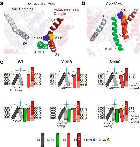 Figure 8. Proposed molecular mechanisms underlying effects of S140G and V141M on channel gating.(a,b) Homology model of open tetrameric KCNQ1 and KCNE1 from Kang et al.12 from an extracellular (a) or side view (b). On the S1 helix, S140 (yellow) points toward S4, whereas V141 (blue) points toward KCNE1. The extracellular end of the S6 helix is in proximity to KCNE1. (c) Cartoon representation of proposed molecular mechanisms of S140G and V141M. The channel pore is represented by a cylinder with the K+ permeation pathway at its center. For KCNQ1 alone (top row), V141M has minimal effect on channel gating, whereas S140G disrupts S4 and slows its movement. In the presence of KCNE1 (bottom row), both V141M and S140G alter VSD-pore coupling and slow pore closing. V141M may directly disrupt the orientation of KCNE1, impairing motion of the S6 during channel closing. S140G may cause a similar disruption of KCNE1 indirectly through other residues on S1 that face KCNE1.