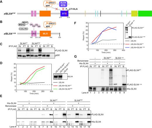 A key step in the Fanconi anemia pathway of DNA interstrand crosslink (ICL) repair is the ICL unhooking by dual endonucleolytic incisions. SLX4/FANCP is a large scaffold protein that plays a central role in ICL unhooking. It contains multiple domains that interact with many proteins including three different endonucleases and also acts in several other DNA repair pathways. While it is known that its interaction with the endonuclease XPF-ERCC1 is required for its function in ICL repair, which other domains act in this process is unclear. Here, we used Xenopus egg extracts to determine ICL repair specific features of SLX4. We show that the SLX4-interacting endonuclease SLX1 is not required for ICL repair and demonstrate that all essential SLX4 domains are located at the N-terminal half of the protein. The MLR domain is crucial for the recruitment of XPF-ERCC1 but also has an unanticipated function in recruiting SLX4 to the site of damage. Although we find the BTB is not essential for ICL repair in our system, dimerization of SLX4 could be important. Our data provide new insights into the mechanism by which SLX4 acts in ICL repair.
