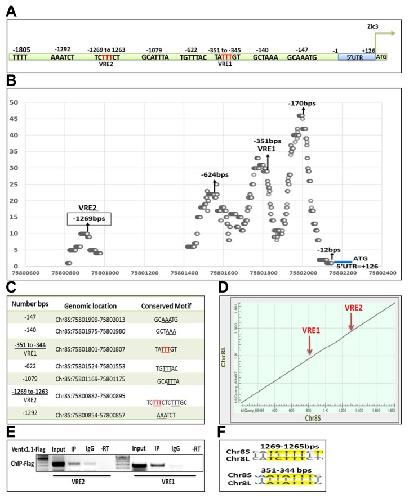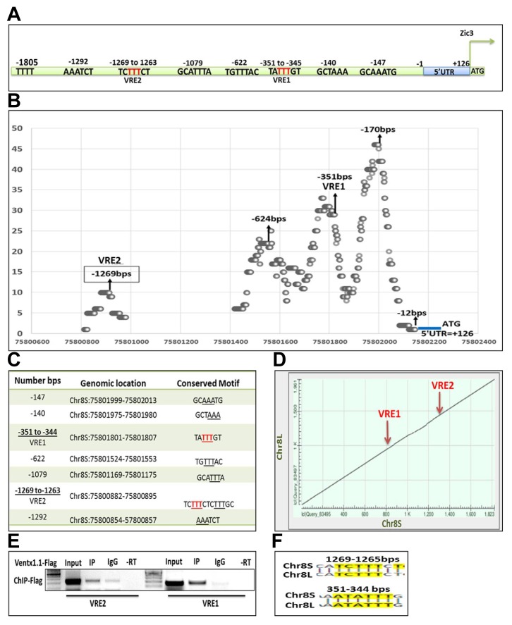 Fig. 2. Genome-wide Xenopus ChIP-Seq of Ventx1.1 identifies two Ventx1.1 response cisacting elements (VRE1 and VRE2) on the zic3 promoter(A) Putative Ventx1.1 response consensus binding elements (VREs) are presented within the upstream promoter region of zic3 gene. (B) ChIP-Seq coverage plot of 3Flag-Ventx1.1 on the zic3 promoter. (C) Putative VRE sequences and their locations within the zic3 promoter. (D) This plot is showing the similarity in structure between Chr8S and Chr8L of zic3 promoter with the VRE1 and VRE2 locations marked. (E) In the ChIP assay, 3Flag-Ventx1.1 construct (500 pg/embryos) was injected at the one-cell stage and the embryos were harvested at stage 11 in 30% MMR solution. Anti-Flag antibody was used to immune-precipitate the endogenous zic3 promoter region. VRE1 and VRE2 were measured by PCR with specific zic3 promoter primers. (F) Consensus binding motifs of VRE1 and VRE2 are fully matched in both Chr8S and Chr8L of the zic3 promoter regions.
