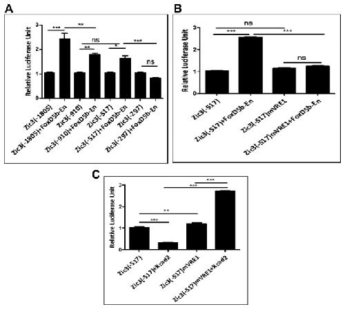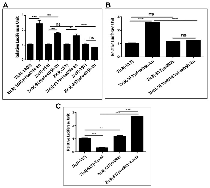 Fig. 4. VRE1 mutation partially abolishes negative and positive effects of Xcad2 and FoxD5b-En, respectivelyDifferent serially-deleted zic3(40 pg/embryos) promoter constructs were co-injected with and without FoxD5b-En (280 pg/embryos) at the one-cell stage and grown until stage 11 to measure the relative promoter activity. (A) FoxD5b-En increased the relative promoter activity of zic3(−1805) promoter region compared to zic3(−1805) alone. (B) zic3(−517) and zic3(−517)mVRE1 promoter constructs were co-injected with and without FoxD5b-En in separate groups. The FoxD5b-mediated induction in the relative promoter activity of zic3(−517) was abolished in zic3(−517)mVRE1. (C) zic3(−517) and zic3(−517)mVRE1 promoter constructs were co-injected with and without Xcad2 in separate groups. The Xcad2-mediated reduction in the relative promoter activity of zic3(−517) was abolished in zic3(−517)mVRE1 reporter construct. The data are shown as mean ± S.E. of the values from at least three independent experiments. Differences were considered significant at P < 0.05.