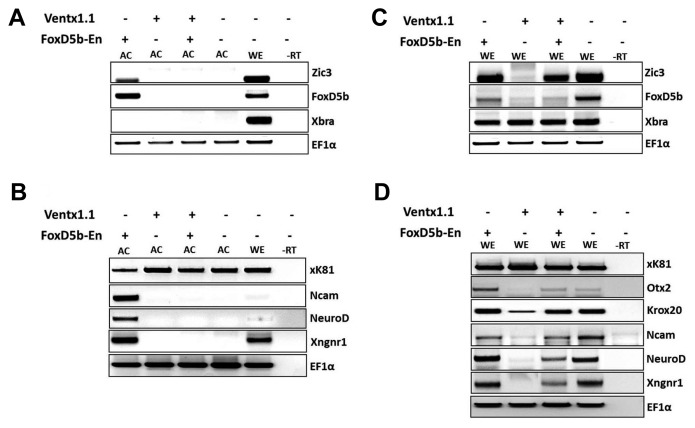 Fig. 1. Ventx1.1 represses early and late neural genes in Xenopus whole embryo and animal cap explantsVentx1.1 (500 pg/embryo) mRNA was co-injected with and without FoxD5b-En mRNA (280 pg/embryos) at the one-cell stage, followed by dissection of the animal cap explants (AC) at stage 8 and harvesting at stage 11 and 24 respectively. The relative gene expressions were analyzed by RT-PCR: (A and C) Ventx1.1 reduced the FoxD5b-induced expression of zic3 and foxD5b in both animal cap explants (A) and whole embryos (WE) (B) at stage 11. (B and D) Ventx1.1 reduced the FoxD5b-En-induced expression of ncam, Xngnr (pan-neural markers) and NeuroD (neuronal differentiation marker) while induced the expression of xK81 (keratin marker) at stage 24. EF1α loading control, non-injected animal caps (negative control), whole embryo (WE) (positive control), control reaction without reverse transcriptase (−RT).