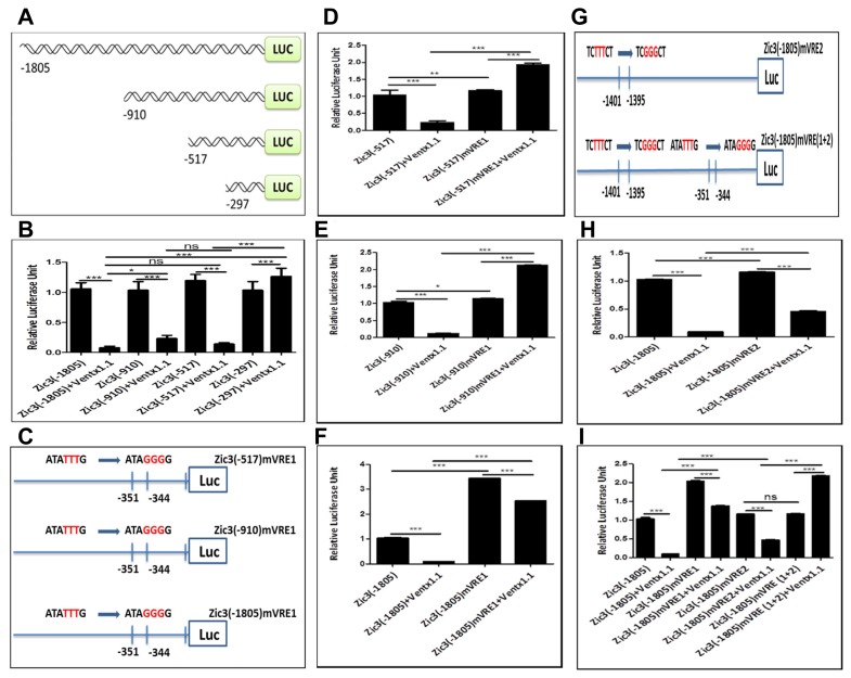 Fig. 3. Site-directed mutagenesis of VRE1 and VRE2 within the zic3 promoter-reporter construct abolishes the repressional activity of Ventx1.1. on the reporter(A) Schematic representation of serially-deleted zic3 promoter constructs. (A–I) Different serially-deleted zic3 (40 pg/embryos) promoter constructs were co-injected with and without Ventx1.1 (500 pg/embryos) at the one-cell stage and grown until stage 11 to measure the relative promoter activity. The data are shown as mean ± S.E. of the values from at least three independent experiments. Differences were considered significant at P < 0.05.