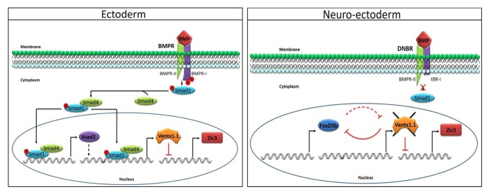 Fig. 5. Schematic diagram depicting Ventx1.1 as a key protein in the neural inhibitory circuit of BMP4/Smad1/Xcad2/Ventx1.1 and the reciprocal inhibitory circuit of FoxD5b/Ventx1.1Ventx1.1 seems play an essential role in the BMP4/Smad1/Xcad2/Ventx1.1-mediated neural inhibition in Xenopus embryos during gastrula.