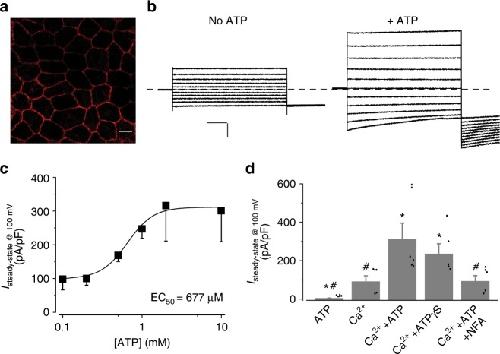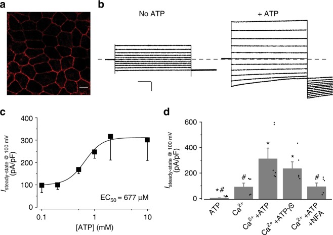 Fig. 2. The influence of ATP on hBest1-mediated Ca2+-dependent Clâ current in human RPE cells. a Confocal image showing plasma membrane localization of hBest1 in human RPE (Scale bar, 10âμm). b Representative current traces recorded from a WT iPSC-RPE in the absence (left) or presence (right) of 2âmM ATP (Scale bar, 1ânA, 125âms). c ATP-dependent activation of surface currents in WT iPSC-RPE. Steady-state current density recorded at +100âmV plotted vs. free [ATP]i, nâ=â5â6 for each point. The plot was fitted to the Hill equation. d Bar chart showing the steady-state current amplitudes in the presence of ATP (10âmM) without Ca2+, Ca2+ (0.6âμM) without ATP, Ca2+ (0.6âμM)â+âATP (10âmM), Ca2+ (0.6âμM)â+âATPγS (10âmM), and Ca2+ (0.6âμM)â+âATP (10âmM)â+âNFA (100 μM) in WT iPSC-RPE, nâ=â5â6 for each bar. *#Pâ<â0.05 compared to currents with Ca2+ and Ca2+â+âATP, respectively, using one-way ANOVA and Bonferroni post hoc analyses. All error bars in this figure represent s.e.m.