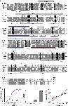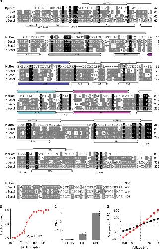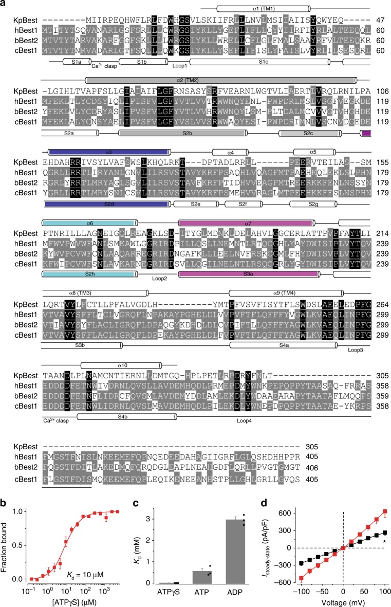 Fig. 3. ATP interacts with and activates bBest2. a Structure-based sequence alignment of KpBest, hBest1, bBest2, and cBest1. The KpBest structure is used to restrict sequence gaps to interhelical segments. Black background, identical residues in all four species; gray background, identical residues in two or three species. The secondary structures of KpBest and cBest1 are labeled above and below the sequences, respectively. The four loops (1–4) potentially involved in ATP binding are labeled below the cBest1 secondary structure. Critical helices potentially involved in channel activation are highlighted in the same colors as those in Fig. 7. b The MST binding curve of bBest2 to ATPγS. Protein fraction bound vs. [ATPγS], n = 3 for each point. c Bar chart showing the binding affinities of bBest2 to ATP analogs. n = 3 for each bar. d Population steady-state current–voltage relationships of bBest2 transiently expressed in HEK293 cells without (black) or with (red) ATP (10 mM), n = 9–13 for each point. *P < 0.05 compared to cells in the presence of ATP, using two-tailed unpaired Student t test. All error bars in this figure represent s.e.m.