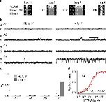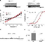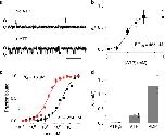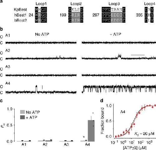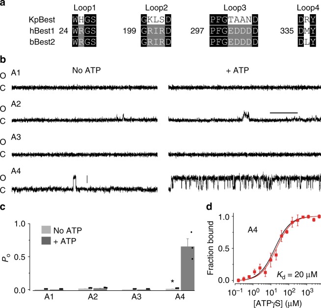 Fig. 4. Mapping ATP-binding motif(s) in KpBest. a Candidate ATP-binding motifs in KpBest, hBest1, and bBest2. Black background, identical residues in all three sequences; gray background, identical residues in two sequences. Numbers indicate the position of the first residue in each motif on hBest1. b Current traces of single KpBest mutant channels recorded from planar lipid bilayers at 80 mV in the absence or presence of 2 mM ATP (Scale bar, 3.5 pA, 250 ms). c Bar chart showing the open probability of KpBest mutant channels in the absence or presence of 2 mM ATP. n = 3 for each bar. *P < 0.05 compared to currents from the same channels in the presence of ATP, using two-tailed unpaired Student t test. d The MST binding curve of KpBest A4 to ATPγS (red). Protein fraction bound vs. [ATPγS], n = 3 for each point. The binding curve of WT KpBest to ATPγS (black) is shown for comparison. All error bars in this figure represent s.e.m.