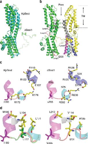 Fig. 7. Structural analysis of bestrophin channels. a Structure alignment of KpBest (blue) and cBest1 (green) as shown by superposition of their protomers. b Ribbon diagram of two oppositely facing (144°) protomers of an hBest1 pentamer is shown with the extracellular side on the top. The side chains of I201 are in red. Loops 1â4 on the left protomer are in red. Helices surrounding the ATP-binding loop on the right protomer are labeled in the same colors as those in (c, d), Fig. 3A and Figure S5 for comparison. c Visualization of the ATP-binding loop (red), and critical residues potentially involved in ATP binding. Left, KpBest; right, cBest1. d Visualization of the ATP-binding loop (red for WT and green for the L177T mutant) and the surrounding hydrophobic residues. Left, KpBest; right, cBest1