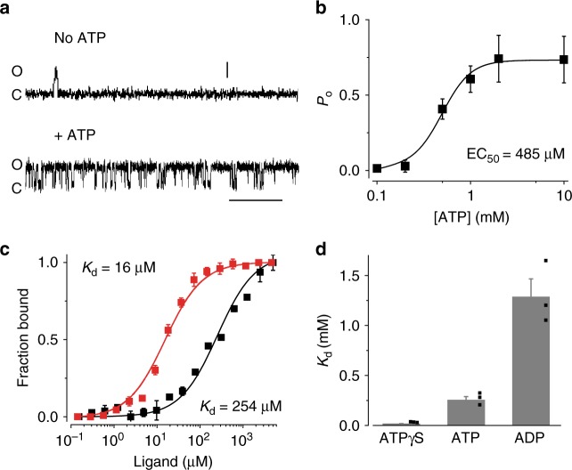 Fig. 1. The influence of ATP on KpBest and the interaction between them. a Current traces of single KpBest channels recorded from planar lipid bilayers at 80 mV in the absence (top) and presence (bottom) of 2 mM ATP (Scale bar, 3.5 pA, 250 ms). b The open probability of the KpBest channel with different concentrations of ATP. n = 3 for each point. The plot was fitted to the Hill equation. c The MST binding curves of KpBest to ATP (black) and ATPγS (red). Protein fraction bound vs. ligand, n = 3 for each point. d Bar chart showing the binding affinities of KpBest to ATP analogs. n = 3 for each bar. All error bars in this figure represent standard error of the mean (s.e.m.)