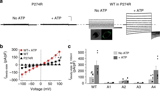 Fig. 5. The role of candidate motifs on hBest1 in ATP-dependent activation. a Left, representative current traces recorded from hBest1 P274R iPSC-RPE. Right, representative current traces in hBest1 P274R iPSC-RPE complemented with WT hBest1-GFP (Scale bar, 1.5ânA, 100âms). Insert, confocal images showing expression of WT hBest1-GFP in rescued P274R iPSC-RPE (Scale bar, 10âμm). b Population steady-state currentâvoltage relationships in P274R iPSC-RPE, and in P274R iPSC-RPE complemented with WT hBest1-GFP in the absence or presence of 2âmM ATP, nâ=â5â6 for each point. *#Pâ<â0.05 compared to uninfected cells and complemented cells in presence of ATP, respectively, using two-tailed unpaired Student t test. c Bar chart showing the steady-state current amplitudes of P274R iPSC-RPE complemented with WT or mutant hBest1 channels, nâ=â5â6 for each bar. #*Pâ<â0.05 compared to currents from the same set of cells in the presence of 2âmM ATP, respectively, using two-tailed unpaired Student t test. All error bars in this figure represent s.e.m.