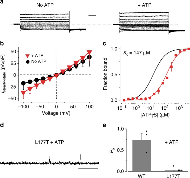 Fig. 6. The influence of a patient-specific mutation on ATP-dependent activation. a Representative current traces recorded from hBest1 I201T iPSC-RPE in the absence or presence of 2âmM ATP (Scale bar, 300âpA, 100âms). b Population steady-state currentâvoltage relationships in hBest1 I201T iPSC-RPE in the absence or presence of 2âmM ATP; nâ=â5â6 for each point. c The MST binding curves of KpBest L177T (red) to ATPγS. Protein fraction bound vs. [ATPγS], nâ=â3 for each point. The binding curve of WT KpBest to ATPγS (black) is shown for comparison. d Representative current trace of single KpBest L177T mutant channel recorded from planar lipid bilayers at 80âmV in the presence of 2âmM ATP (Scale bar, 2âpA, 250âms). e Bar chart showing the open probability of KpBest WT and L177T channels in the presence of 2âmM ATP, nâ=â3 for each bar. *Pâ<â0.05 compared to the open probability of WT KpBest in the presence of ATP, using two-tailed unpaired Student t test. All error bars in this figure represent s.e.m.