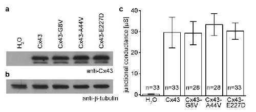 recognized Cx43. H2O injected controls did not express Cx43 as expected. Wild-type Cx43, Cx43-G8V, Cx43-