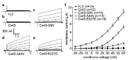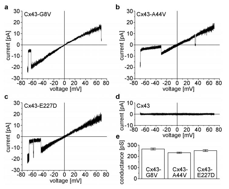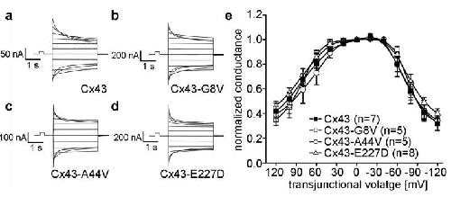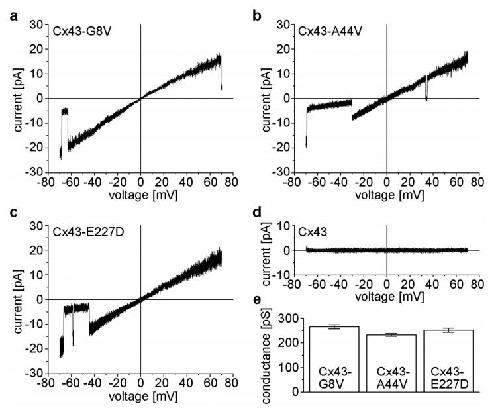 Current-voltage relations for Cx43-A44V and Cx43-E227D were linear, whereas those of Cx43-G8V showed