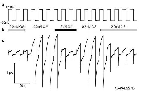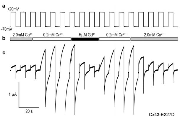 containing 2mM Ca2+, 0.2mM Ca2+, or 5 µM Gd3+ (b). In the example shown for a Cx43-E227D expressing