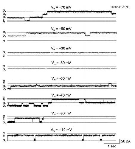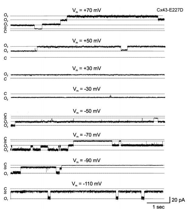 one to two open channels at voltages ranging from −110 to +70mV. Cx43-E227D hemichannels were
