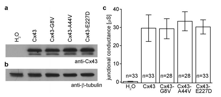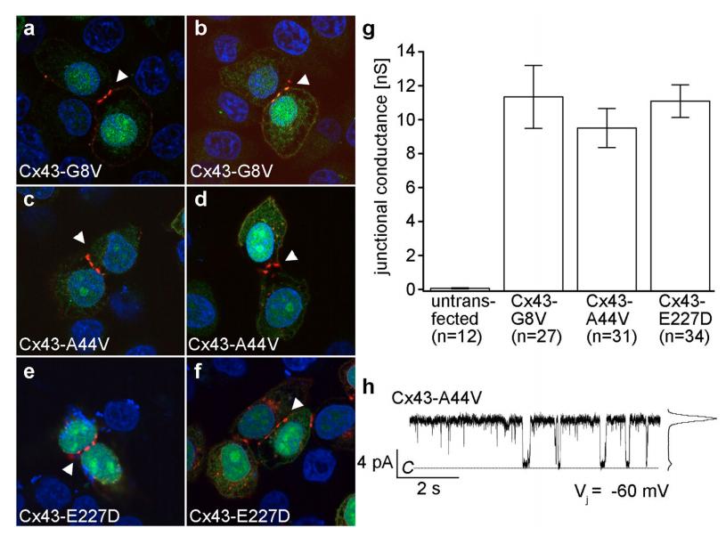 and formation of functional intercellular channels. Cx43-G8V (a,b), Cx43-A44V (c,d), and Cx43-E227D