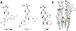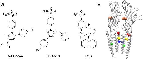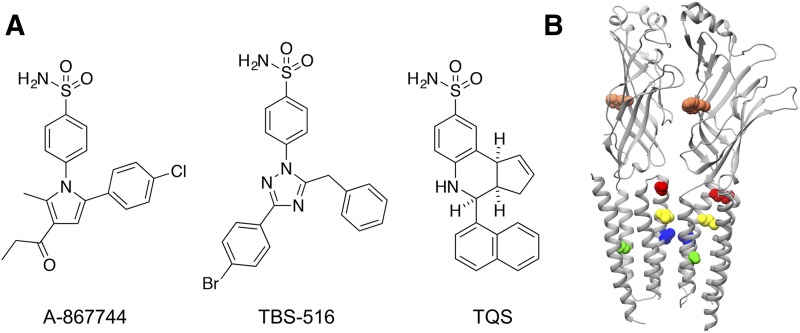 Fig. 1. Chemical structures of α7 nAChR PAMs and nAChR mutations. (A) The structure of the three compounds examined by electrophysiological techniques are shown (A-867744, TBS-516, and TQS). In addition, a larger group of PAMs with close chemical similarity to these three compounds (7 compounds similar to A-867744, 3 similar to TBS-516, and 24 similar to TQS) were selected for computer docking studies. Details of the chemical structure of all 37 compounds selected for docking studies is provided in Supplemental Table 1. (B) Location of α7 nAChR amino acids examined by site-directed mutagenesis. Mutated amino acids are indicated as spheres and correspond to W54 (coral), S222 (green), L247 (blue), M253 (yellow), and M260 (red). |