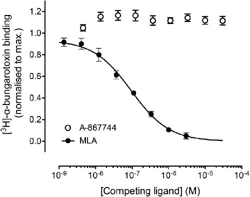 Fig. 2. Competition radioligand binding. Equilibrium radioligand binding was performed with [3H]-α-BTX (1 nM) in human kidney tsA201 cells expressing α7 nAChRs. A-867744 (3 nM to 30 μM) caused no significant displacement of [3H]-α-BTX binding, whereas the orthosteric antagonist MLA caused complete displacement of specific radioligand binding. Data points are means of triplicate samples (±S.E.M.) from a single experiment, and data are typical of three independent experiments. |