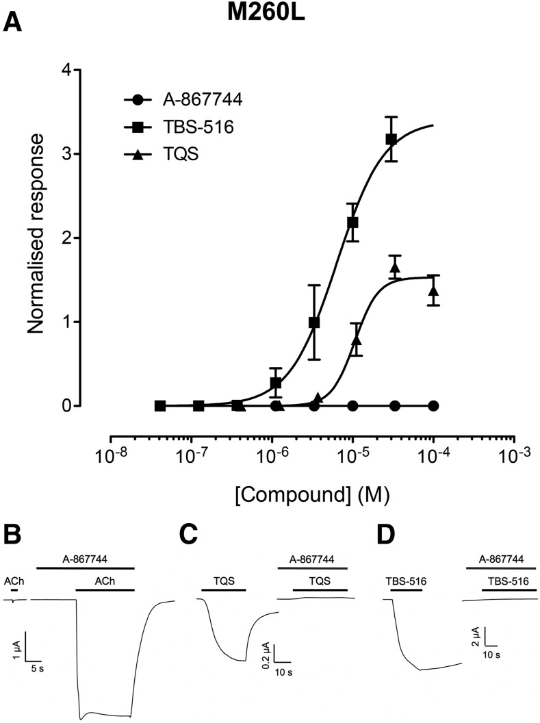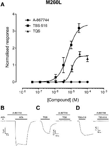 Fig. 3. Allosteric modulation of α7M260L by A-867744, TBS-516, and TQS. Mutated α7M260L nAChRs were expressed in Xenopus oocytes and examined by two-electrode voltage-clamp recording. (A) Concentration-response data illustrating agonist activation by TBS-516 and TQS but the absence of agonist activity with A-867744. Data are the mean ± S.E.M. of three independent experiments, each from different oocytes. Data are normalized to the maximum acetylcholine response. (B) Representative traces illustrating responses to acetylcholine (100 μM; left) together with acetylcholine responses from the same oocyte after preapplication (10 seconds) and coapplication of A-867744 (1 μM; right). (C) Representative traces illustrating responses to TQS (30 μM; left) together with TQS responses from the same oocyte after preapplication (10 seconds) and coapplication of A-867744 (1 μM; right). (D) Representative traces illustrating responses to TBS-516 (10 μM; left) together with TBS-516 responses from the same oocyte after preapplication (10 seconds) and coapplication of A-867744 (1 μM; right). |