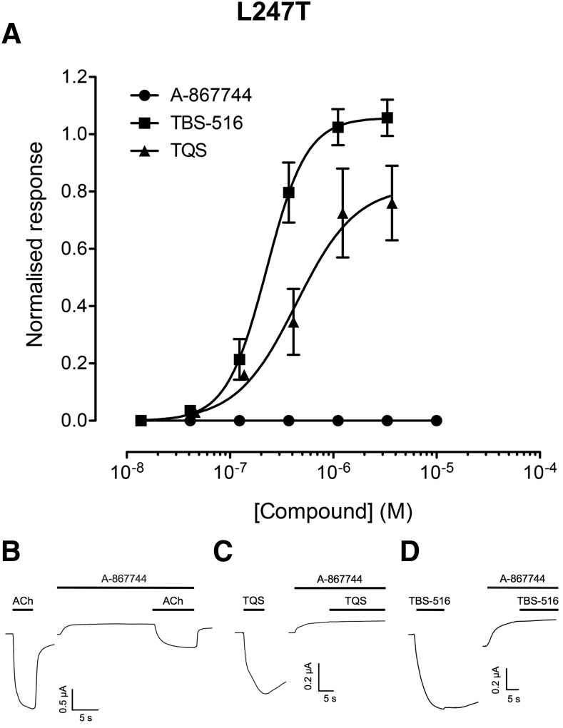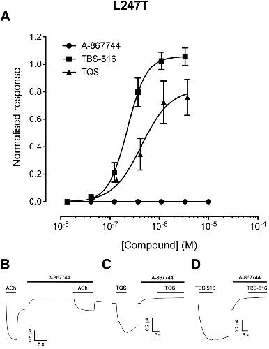 Fig. 4. Allosteric modulation of α7L247T by A-867744, TBS-516, and TQS. Mutated α7L247T nAChRs were expressed in Xenopus oocytes and examined by two-electrode voltage-clamp recording. (A) Concentration-response data illustrating agonist activation by TBS-516 and TQS but the absence of agonist activity with A-867744. Data are the mean ± S.E.M. of three independent experiments, each from different oocytes. Data are normalized to the maximum acetylcholine response. (B) Representative traces illustrating responses to acetylcholine (10 μM; left) together with acetylcholine responses from the same oocyte after preapplication (10 seconds) and coapplication of A-867744 (1 μM; right). (C) Representative traces illustrating responses to TQS (10 μM; left) together with TQS responses from the same oocyte after preapplication (10 seconds) and coapplication of A-867744 (1 μM; right). (D) Representative traces illustrating responses to TBS-516 (10 μM; left) together with TBS-516 responses from the same oocyte after preapplication (10 seconds) and coapplication of A-867744 (1 μM; right). |