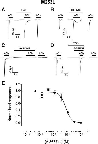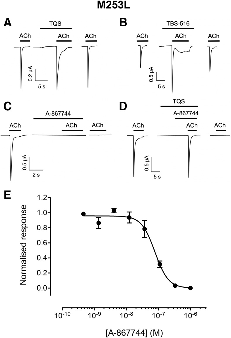 Fig. 5. Allosteric modulation of α7M253L by A-867744, TBS-516, and TQS. Mutated α7M253L nAChRs were expressed in Xenopus oocytes and examined by two-electrode voltage-clamp recording. (A) Representative traces illustrating responses to acetylcholine (100 μM; left), acetylcholine responses after preapplication (10 seconds) and coapplication of TQS (10 μM; middle), and response to acetylcholine after washing (right). (B) Representative traces illustrating responses to acetylcholine (100 μM; left), acetylcholine responses after preapplication (10 seconds) and coapplication of TBS-516 (10 μM; middle), and response to acetylcholine after washing (right). (C) Representative traces illustrating responses to acetylcholine (100 μM; left), and block of acetylcholine responses after preapplication (10 seconds) and coapplication of A-867744 (1 μM; middle). The acetylcholine response did not recover, even after a prolonged (10 minutes) wash (right). (D) Representative traces illustrating responses to acetylcholine (100 μM; left) and after preapplication of TQS (10 seconds), preapplication of A-867744 and TQS (5 seconds), and then coapplication of A-867744 (1 μM) and TQS (10 μM) (middle). TQS was preapplied for 10 seconds and A-867744 for 5 seconds. The acetylcholine response did not recover, even after a prolonged (10 minutes) wash (right). (E) Concentration-response data illustrating inhibition by A-867744 of responses to acetylcholine (100 μM). Data are the mean ± S.E.M. of four independent experiments, each from different oocytes. |