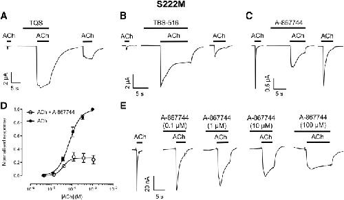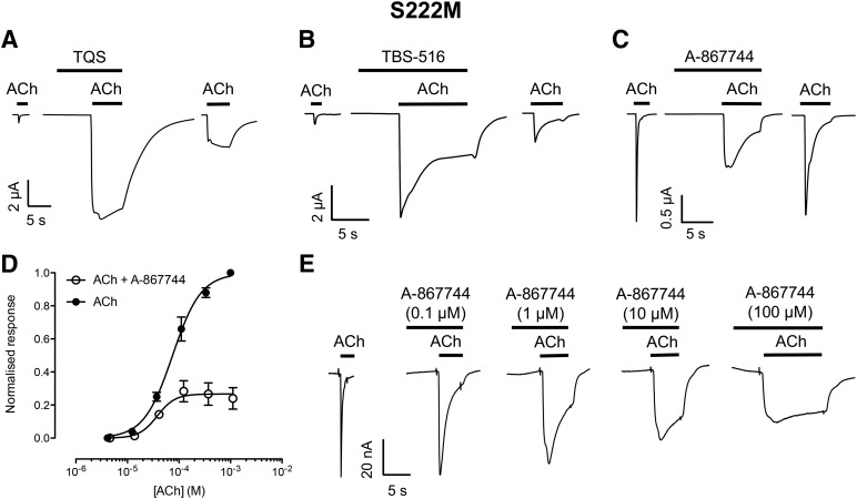 Fig. 6. Allosteric modulation of α7S222M by A-867744, TBS-516, and TQS. Mutated α7S222M nAChRs were expressed in Xenopus oocytes and examined by two-electrode voltage-clamp recording. (A) Representative traces illustrating responses to acetylcholine (100 μM; left), acetylcholine responses after preapplication (10 seconds) and coapplication of TQS (10 μM; middle), and response to acetylcholine after washing (right). (B) Representative traces illustrating responses to acetylcholine (100 μM; left), acetylcholine responses after preapplication (10 seconds) and coapplication of TBS-516 (10 μM; middle), and response to acetylcholine after washing (right). (C) Representative traces illustrating responses to acetylcholine (100 μM; left), block of acetylcholine responses after preapplication (10 seconds) and coapplication of A-867744 (1 μM; middle), and response to acetylcholine after washing (right). (D) Agonist concentration-response curve for acetylcholine in the absence and presence of A-867744 (1.5 μM; preapplied for 10 seconds and then coapplied with acetylcholine). Data are the mean ± S.E.M. of at least three independent experiments and are normalized to the maximum response obtained with ACh in the absence of A-867744. (E) When A-867744 was preapplied and coapplied with acetylcholine, positive modulatory effects (a reduction in agonist-evoked desensitization) was associated with a reduction in peak agonist responses. |