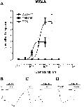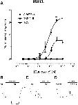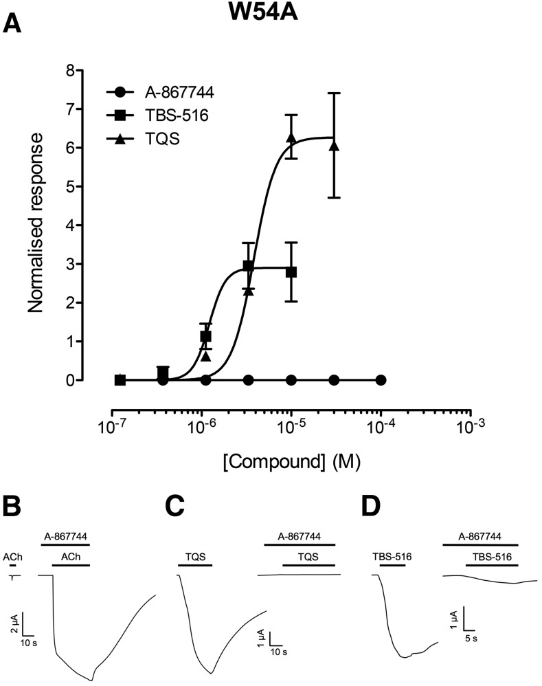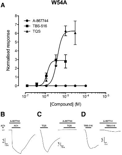 Fig. 7. Allosteric modulation of α7W54A by A-867744, TBS-516, and TQS. Mutated α7W54A nAChRs were expressed in Xenopus oocytes and examined by two-electrode voltage-clamp recording. (A) Concentration-response data illustrating agonist activation by TBS-516 and TQS but the absence of agonist activity with A-867744. Data are the mean ± S.E.M. of three independent experiments, each from different oocytes. Data are normalized to the maximum acetylcholine response. (B) Representative traces illustrating responses to acetylcholine (100 μM; left) together with acetylcholine responses from the same oocyte after preapplication (10 seconds) and coapplication of A-867744 (1 μM; right). (C) Representative traces illustrating responses to TQS (10 μM; left) together with TQS responses from the same oocyte after preapplication (10 seconds) and coapplication of A-867744 (1 μM; right). (D) Representative traces illustrating responses to TBS-516 (10 μM; left) together with TBS-516 responses from the same oocyte after preapplication (10 seconds) and coapplication of A-867744 (1 μM; right). |