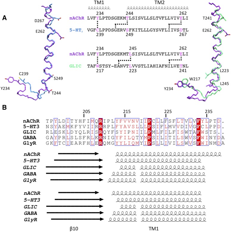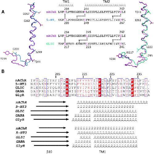 Fig. 8. Refinement of the transmembrane domain of the Torpedo nAChR αγ subunit. (A) Sequence alignment and structural superposition of the TM1-TM2 loop region and TM2 helix of the Torpedo αγ subunit (PDB ID 2BG9; chain A) with that of the 5-HT3 receptor (PDB ID 4PIR; chain A) and GLIC (PDB ID 4HFI; chain A). As has been described previously (Supplemental Fig. 21 in Hibbs and Gouaux, 2011), amino acids from the TM1-TM2 loop of the Torpedo nAChR (e.g., Y234) superpose well with homologous amino acids from other pLGIC structures (C239 of 5-HT3R and W217 of GLIC; indicated by a straight line in the sequence alignment). In contrast, amino acids within the nAChR TM2 domain are out of register by â¼1 turn of the α-helix when compared with other pLGIC structures (e.g., compare E262 of the nAChR structure with D267 of 5-HT3R and T241 of GLIC; indicated by an angled line in the sequence alignment). (B) Alignment of amino acid sequence of the β10 strand and TM1 helix of Torpedo nAChR α subunit with that of related pLGICs (top panel). Also shown is the secondary structure before refinement (middle panel) and after refinement (bottom panel) of the Torpedo nAChR structure. Structural information is derived from the following PDB files: nAChR (2BG9; chain A), 5-HT3 receptor (4PIR; chain A), GABAA receptor (4COF; chain A), glycine receptor (3JAD; chain A), and GLIC (4HFI; chain A). Arrows denote β-strands, spirals denote α-helices, conserved residues are highlighted with white text on a red background, and residues with similar properties are highlighted with red text on a white background. |
