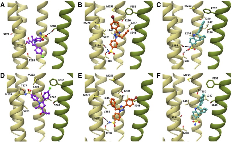 Fig. 9. Docking of A-867744, TBS-516, and TQS and into α7 structural models. After docking studies with the closed and open models (top and bottom panels, respectively), representatives of binding mode clusters are illustrated for A-867744 (A and D; purple). TBS-516 (B and E; orange), and TQS (C and F; cyan). Amino acids that are discussed in the text are shown in stick representation. Predicted hydrogen bonds are shown with dashed lines. In each case, the principal subunit is shown in khaki (on the left in each panel) and the complimentary subunit is shown in olive (on the right in each panel). |