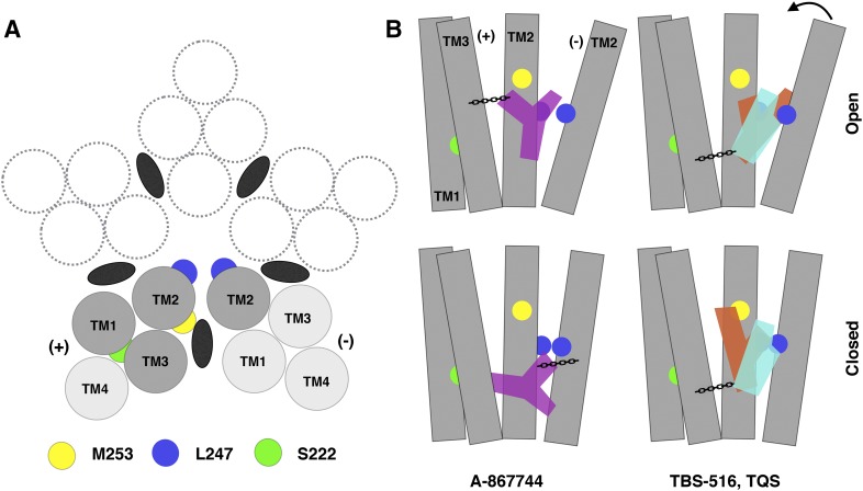 Fig. 10. Intersubunit transmembrane binding site for PAMs on the α7 nAChR. (A) Representation of the transmembrane domain viewed from above, looking down the axis of the channel pore. Black ellipses indicate the location of the intersubunit allosteric binding site identified in this study. (B) Predicted binding modes in the closed and open receptor models of A-867744 (purple), TBS-516 (orange), and TQS (cyan), shown in relation to transmembrane helices (gray rods) from the principal (+) and the complementary (â) subunit interface. The locations of predicted hydrogen bonds are shown with chain links to denote anchoring of the ligands within the binding site. The locations of amino acids M253, L247, and S222 are shown as yellow, blue, and green circles, respectively. An arrow at the top of TM2 from the complementary subunit denotes the motion required for the change in conformation from the open to the closed channel. |