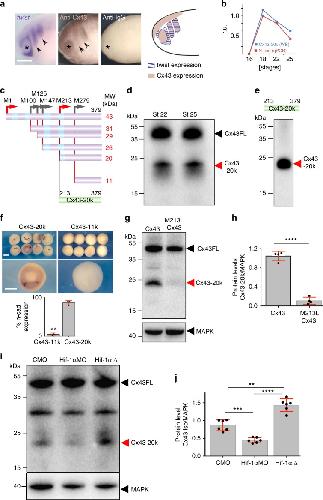 Fig. 5. Cx43-20âkDa isoform is generated from Internal Ribosome Entry Site (IRES). a twist ISH lcompared with Cx43 immunostaining in stage 24 embryos; IgG control antibody; arrow: neural crest; asterisk: eye. Drawing: Cx43 and twist expression summary. Scale barâ=â80âμm. b Cx43-20k protein levels (analyzed by WB) and N-cadherin mRNA (analyzed by qPCR) in st23 NC cells (nâ=â61 embryos, Nâ=â3). câh Cx43 putative IRES and activity of Cx43 isoforms. c Predicted methionine-initiated polypeptide. Green: constructs used in e. Red arrows: abundant peptides found in Xenopus; gray arrows: less abundant or absent peptides in Xenopus. d WB of embryos at NC migratory stages with antibody against the Cx43 C-terminus. Major bands correspond to Cx43FL and Cx43-20k (arrows). e WB of neural crest expressing the Cx43-20k-HA with an antibody against HA. The only band generated corresponds to the M276-initiated peptide (Cx43-20k). f Injection of Cx43-20k, but not Cx43-11k, leads to induction of N-cadherin expression in blastula embryos; percentage of embryos displaying N-cadherin expression, (nCx43-11kâ=â20 embryos nCx43-20kâ=â20 embryos, Nâ=â3). Scale barâ=â70âμm. g WB against Cx43 from embryos at st21 injected with Cx43-HA (lane 1) and with Cx43 mutated in methionine 213 (M213L Cx43, lane 2). h WBâs quantification (nlane1â=â20 embryos nlane2â=â20 embryos, Nâ=â4). i WB of st22 neural crest cells with antibody against the Cx43 C terminus. Lane1: control neural crest; lane 2: neural crest injected with Hif-1α morpholinos; lane 3: neural crest expressing a dominant active form of Hif-1α. j Quantification of Cx43 isoforms (ncontrolâ=â50; nHif-1αMOâ=â50; nHif-1αÎâ=â50 neural crests, Nâ=â6 independent experiments). Hif-1αMO and Hif-1αΠwere previously validated25. In f, h, and j histograms represent mean and bars show s.e.m. (in j one-way ANOVA pâ<â0.001, two-tailed t test, p**â<â0.01, p***â<â0.001, p****â<â0.0001). N number of independent experiments; n sample size. Spread of data in bar charts is shown as overlying dots |