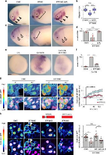 Fig. 8. Cx43 carboxy-terminal is recruited to the nucleus by BTF3. a St24 embryos showing neural crest migration by ISH of twist. Arrowheads show normal and brackets impaired migration. Asterisk indicates the eye. Scale barâ=â40âμm. b Neural crest migration index for the indicated treatment. (nCMOâ=â89, nBTF3MOâ=â98, nBTF3MO-BTF3FLâ=â105, Nâ=â4. c Lateral view of embryos at st24 showing n-cad expression, analyzed by ISH. Arrows show normal and brackets impaired expression, asterisk indicates the eye. d % of n-cad expressing embryos shown in c (nCMOâ=â92, nBTF3MOâ=â127, nbtFL+BTF3MOâ=â98 embryos, Nâ=â4). e Analysis of N-cadherin expression in blastulae embryos (st9). Scale barâ=â30âμm. f n-cad expression levels, representative embryos in e (nCMOâ=â56, nCx-20kâ=â112, nCx-20k-BTF3MOâ=â88 embryos, Nâ=â4). g Temporal analysis of Cx43-20k-GR nuclear localization in st23 neural crest after addition of dxm (time is shown in minutes after dxm treatment). Cx43-20k-GFP is shown in color-coded intensity and n-RFP is used to visualize the nucleus. Graph shows Cx43-20kGR-GFP nuclear fluorescence normalized to the cytosolic fluorescence (nCMOâ=â25, nBTF3MOâ=â32 explants, Nâ=â3). h St23 neural crest, showing color-coded intensity of Cx43-20k-GFP compared with nRFP to visualize nuclear localization. In red diagrams BTF3 NLS deletion constructs are shown. Chart of nucleus vs. cytosol ratio of Cx43-20k-GFP (nCMOâ=â25, nBTF3MOâ=â39, nBTF3MO-btf3â=â58, nBTF3MO-btf3ÎNLSâ=â58, Nâ=â3 independent experiments). Scale bars in g and hâ=â20âμm. In b box plots show the median, box edges represent the 25th and 75th percentiles, and whiskers show spread of data including outliers (Mann Whitney test p***â<â0.001). Histograms in d, f, h, and lines in g represent mean and error bars S.E. (one-way ANOVA; pâ<â0.001; two-tailed t test p**â<â0.01, p***â<â0.001. N number of independent experiments; n sample size. Spread of data in bar charts is shown as overlying dots. n.s. nonsignificant |