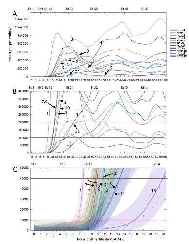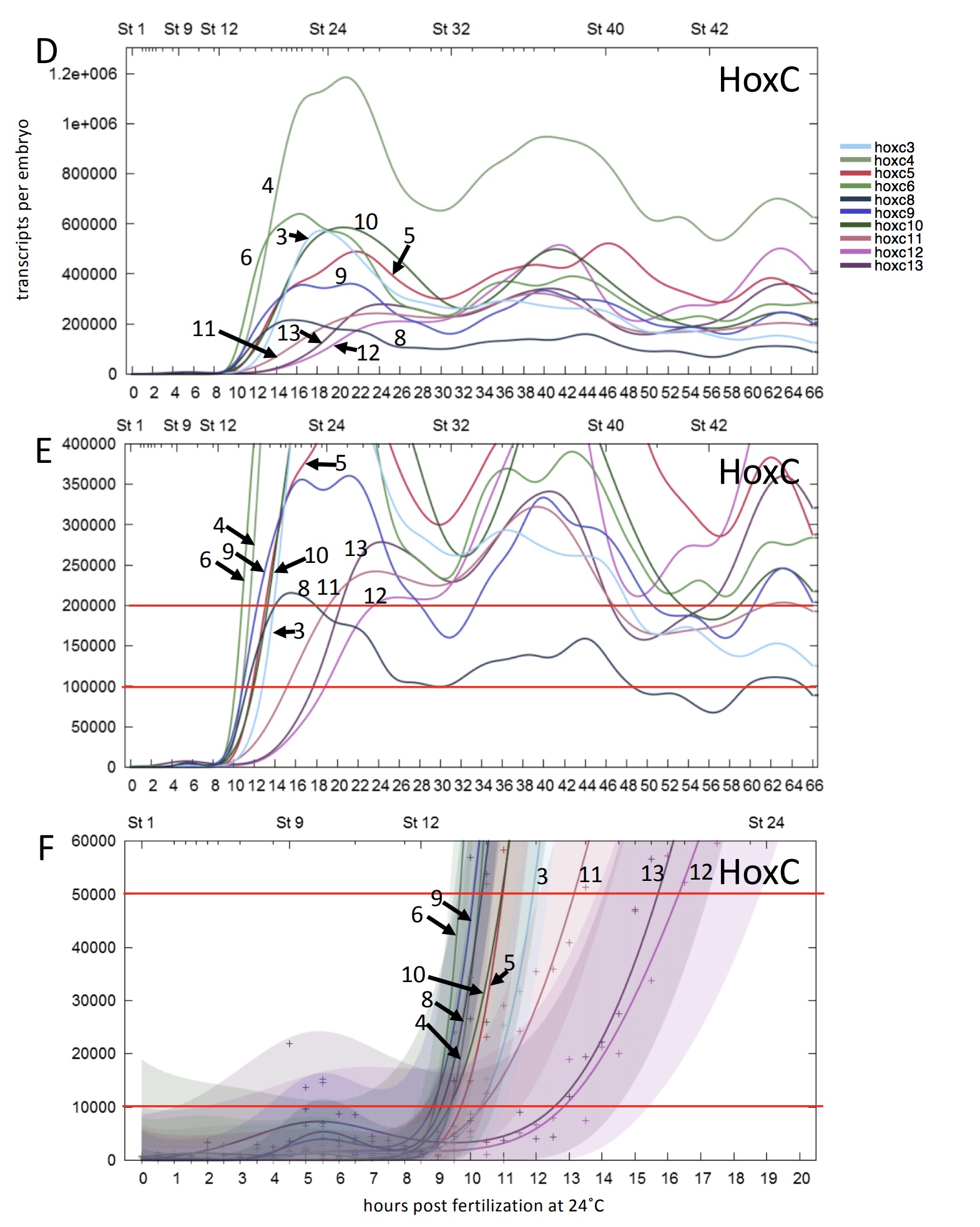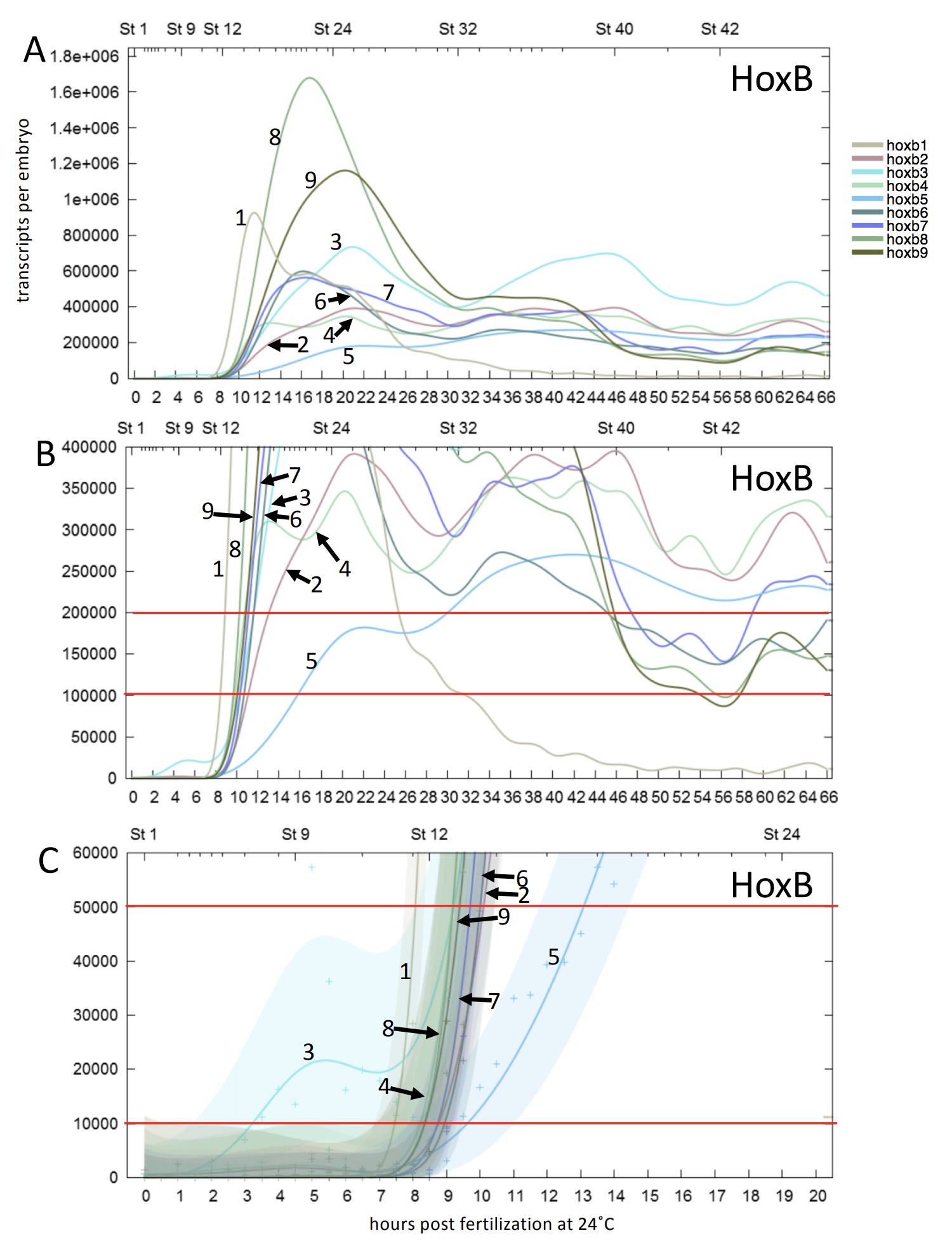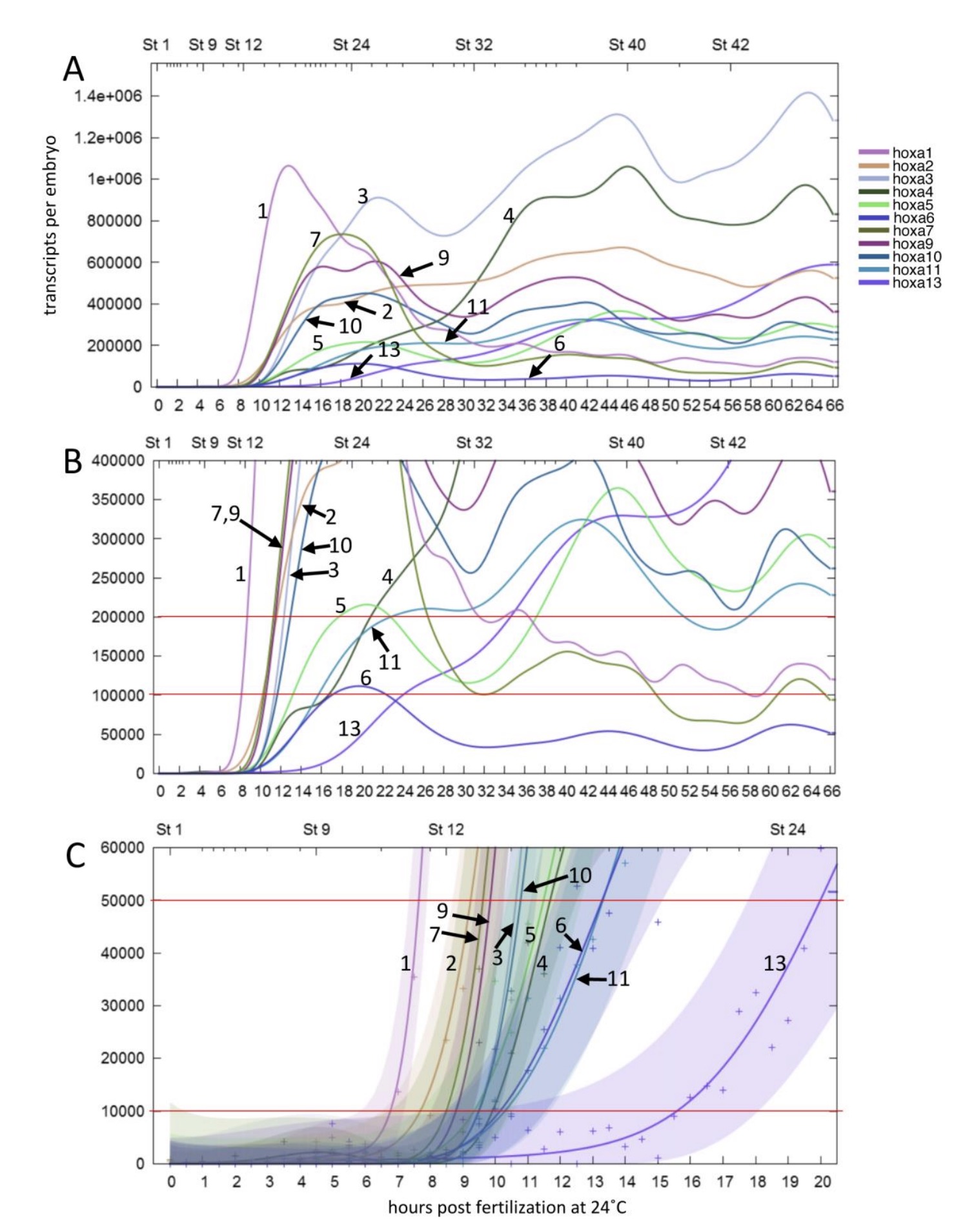 (http://genomics.crick.ac.uk/apps/profiles/), during the first 66 hours post fertilization (hpf) (A and B) or 20 hpf (C). Numbers indicate the PG of the hoxa genes. Red lines are drawn at the 200,000, 100,000, 50,000, and 10,000 transcripts per embryo to determine the order of accumulation (shown in Table 1). The colored regions mark Gaussian process 95% confidence intervals for each gene in (C), which show that genes reached certain numbers of transcripts simultaneously, or the precise order cannot be determined.