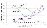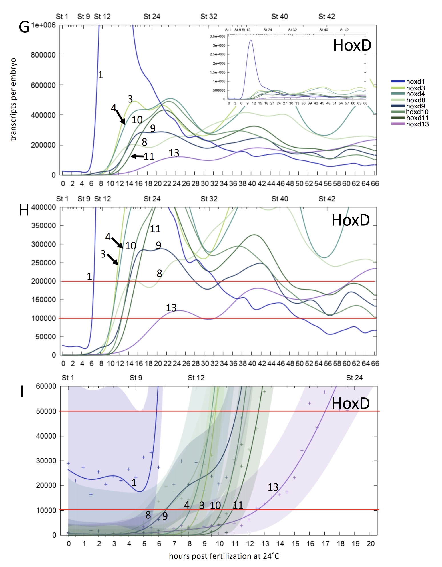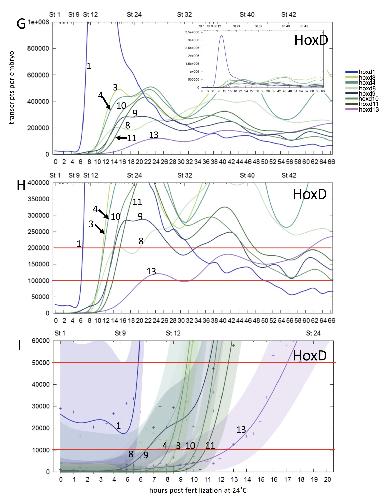 Expression profiles all hoxb (A-C), hoxc (D-F), and hoxd (G-I) genes retrieved from the expression profile database (http://genomics.crick.ac.uk/apps/profiles/). PG numbers are indicated. Red lines are drawn at the 200,000, 100,000, 50,000, and 10,000 transcripts per embryo (shown in Table 1). The colored regions mark Gaussian process 95% confidence intervals for each gene in (C), (F) and (I), which show that genes reached certain numbers of transcripts simultaneously, or the precise order cannot be determined.