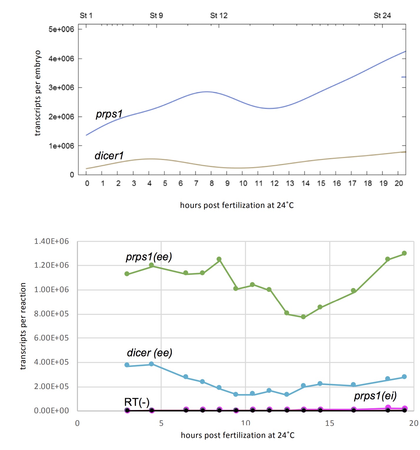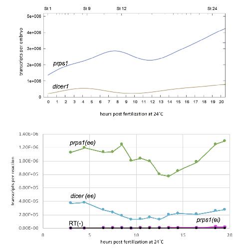 Expression profiles of two housekeeping genes, prps1 and dicer1, by RNA-seq (A)