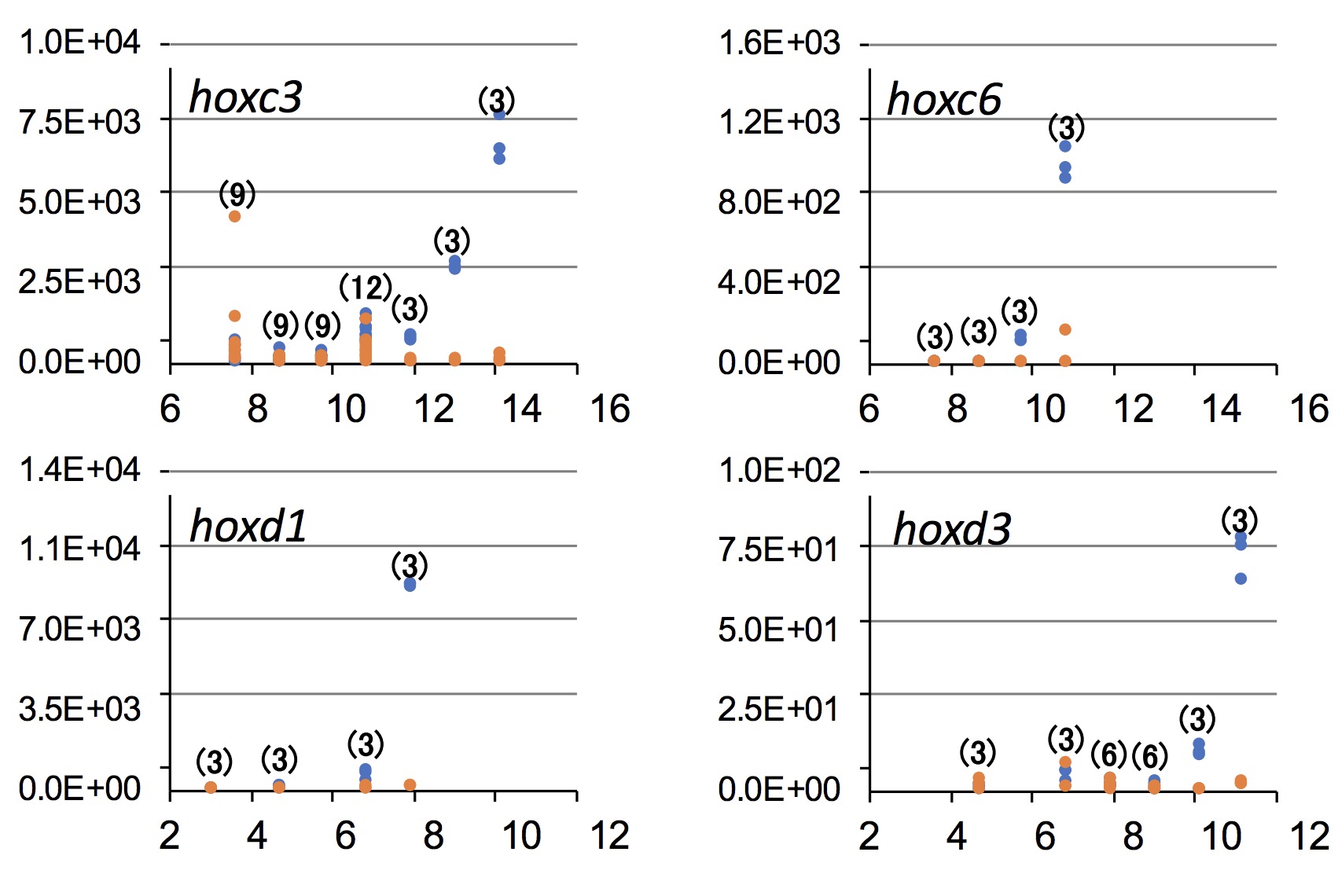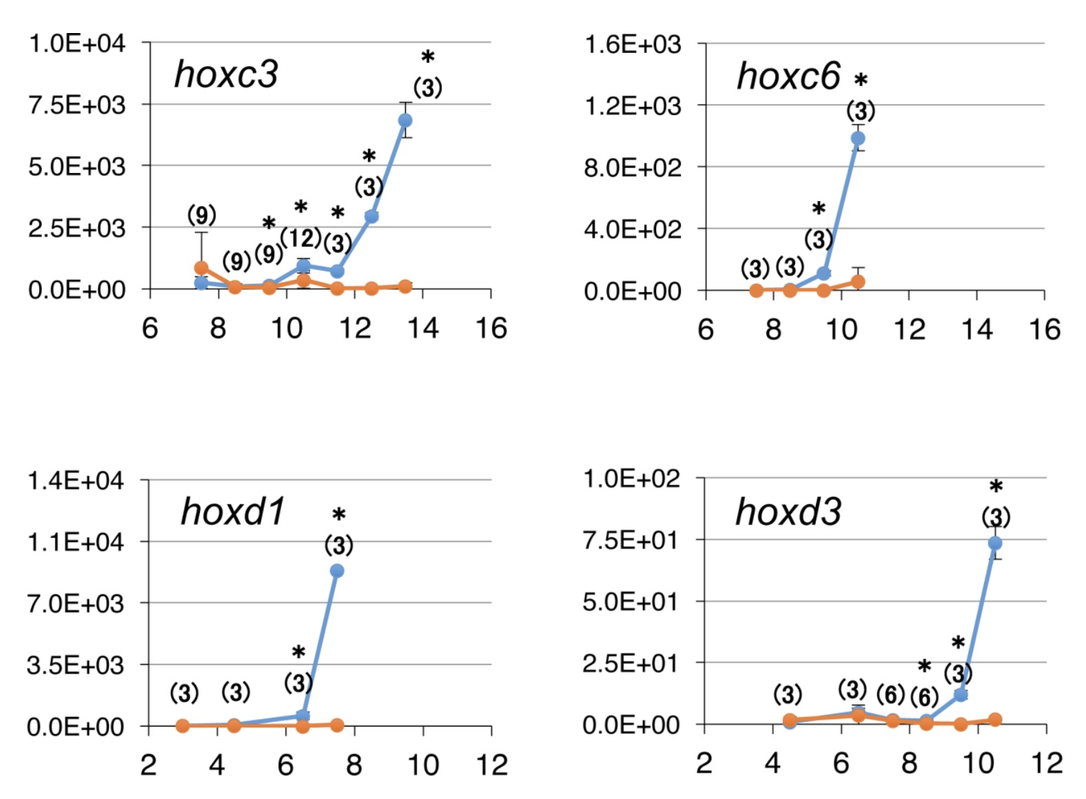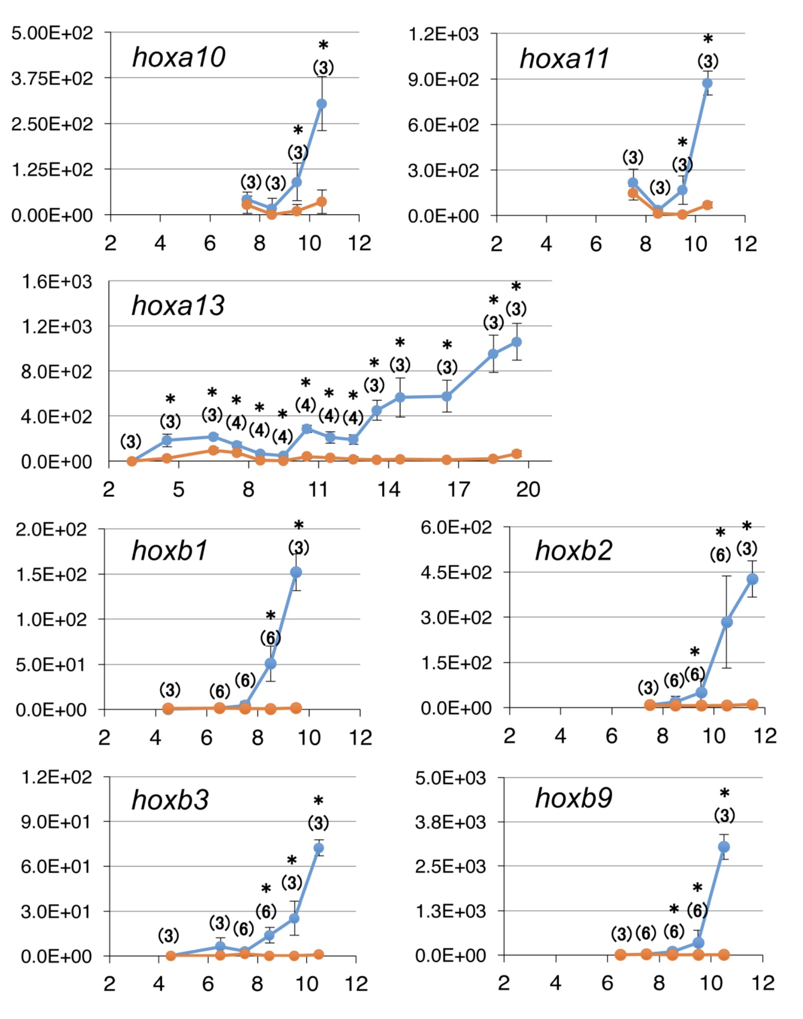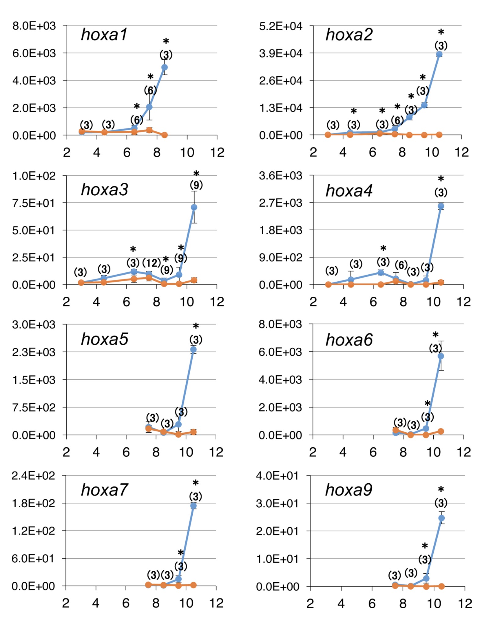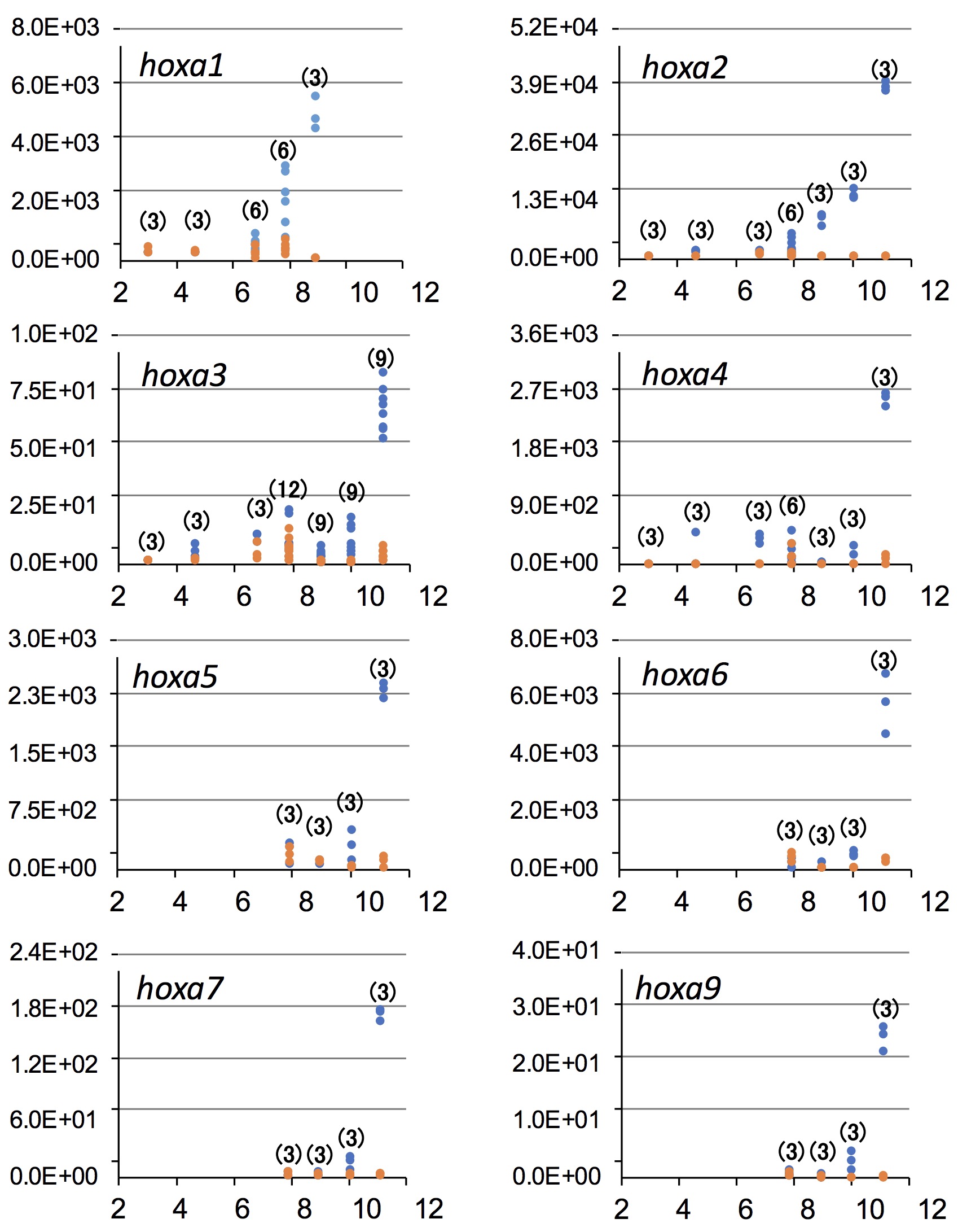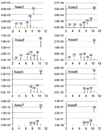 RT-qPCR was performed for 11 hox genes, and the sample sizes are shown in parentheses, between 3 and 12 replicates, and copy numbers per reaction are shown for RT+ (blue) and RT- (orange) samples. The x-axis represents hpf.