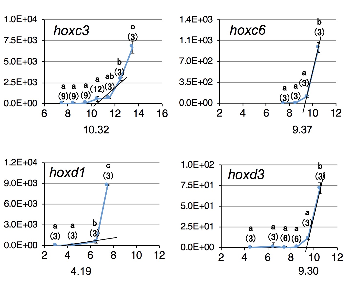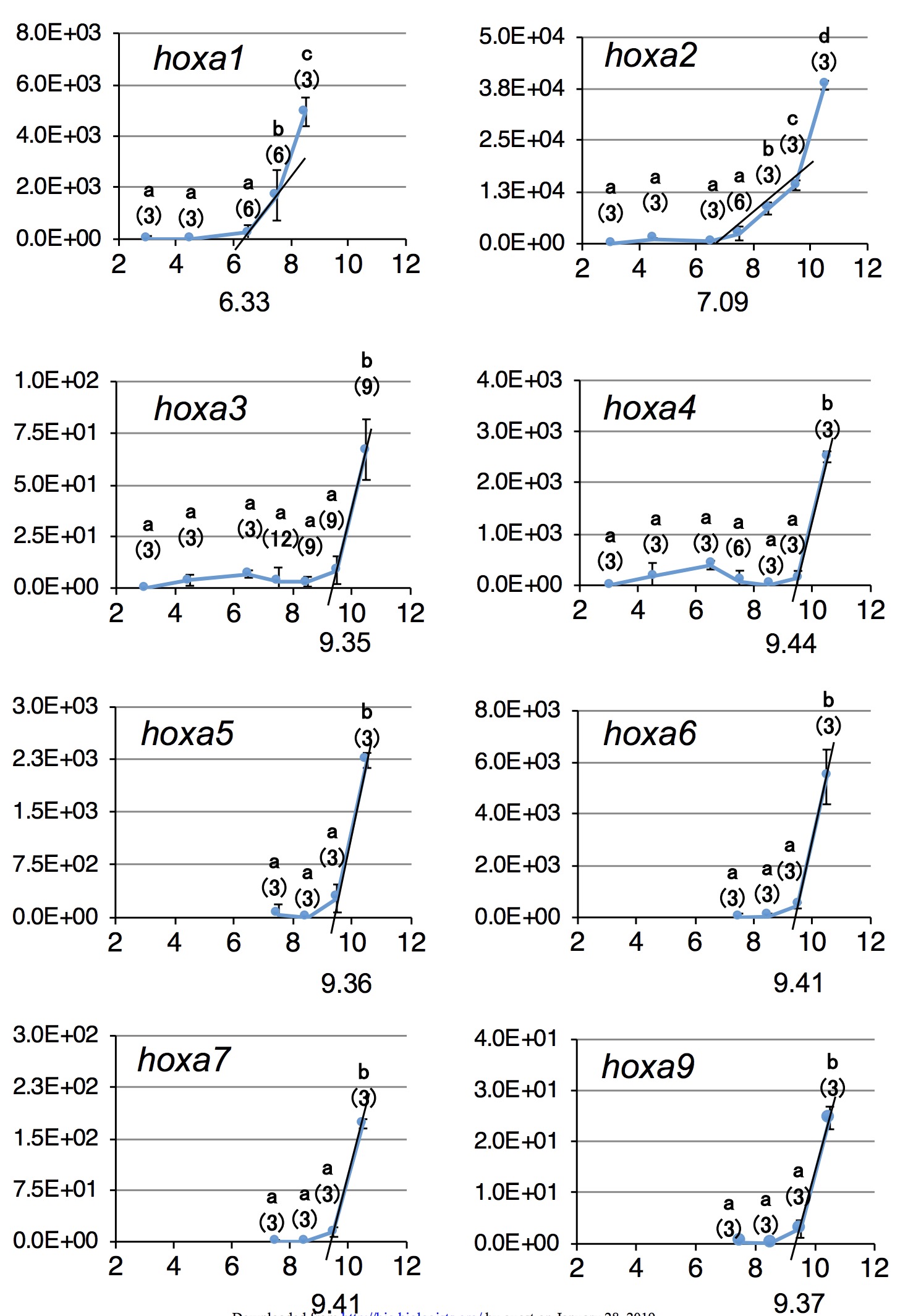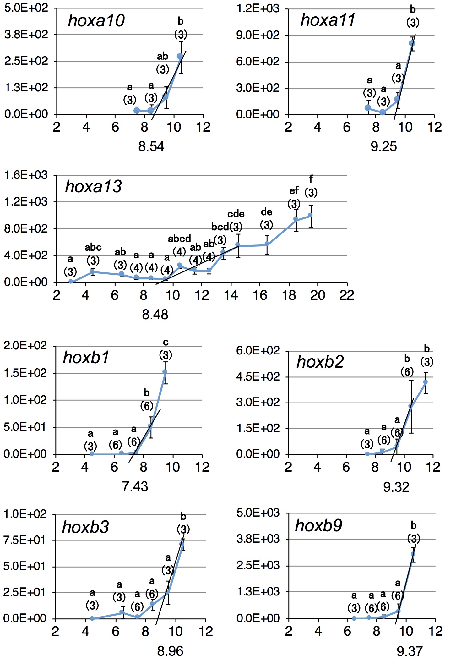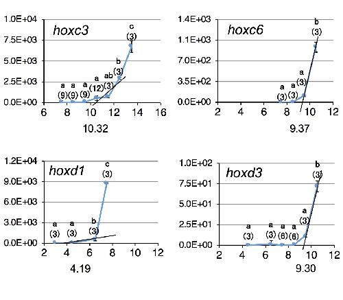 Using the same data sets of qPCR as Fig. 3 or Fig. S3, the numbers of de novo synthesized transcripts were calculated. The data was analyzed using the Tukey-Kramer test and compared. Significant differences among data points are indicated in lowercase alphabets (for example, b represents significantly different from a, while no significant difference was detected between the same alphabets). Two consecutive data points which show significant differences were connected and the intercept to the x-axis (time) was calculated as the onset of active transcription, except for hoxc3, where three points (10, 11.5, and 12.5 hpf) were used for the calculation (see Experimental